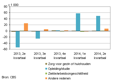 De belangrijkste reden dat meer jongeren aangeven geen betaald werk te kunnen of willen, was dat ze een opleiding of studie volgen. In het tweede kwartaal van 2013 gaven 906 duizend 15- tot 25-jarigen dit op als reden voor het niet kunnen of willen werken. In het tweede kwartaal van 2014 waren dat er 955 duizend. Jongeren kiezen er vaker voor om hun verblijf in de schoolbanken te verlengen en starten daarmee later op de arbeidsmarkt.