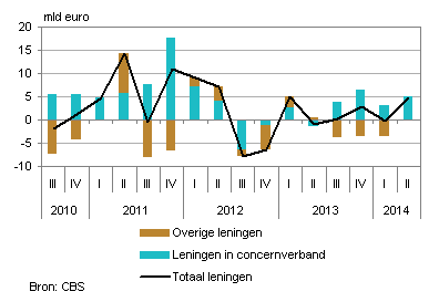 In het tweede kwartaal van 2014 hebben Nederlandse niet-financiële vennootschappen 4,9 miljard euro meer leningen afgesloten dan afgelost. De leningen zijn vooral verstrekt door buitenlandse moeder- en dochtermaatschappijen en niet door Nederlandse financiële instellingen. Huishoudens hebben meer leningen afgelost dan afgesloten, net als in de voorgaande vijf kwartalen.