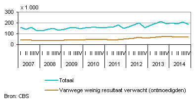 In het vierde kwartaal van 2014 waren er 185 duizend personen die betaald werk wilden voor twaalf uur of meer per week en hiervoor ook op korte termijn beschikbaar waren, maar die gedurende het afgelopen half jaar niet naar werk hadden gezocht. Van deze personen zochten er 69 duizend niet, omdat ze daar weinig resultaat van verwachtten. Deze personen worden ook wel aangeduid als ontmoedigden. Het aandeel ontmoedigden onder degenen die de afgelopen zes maanden niet naar werk zochten, was met 37 procent iets lager dan in het vierde kwartaal van 2013.
