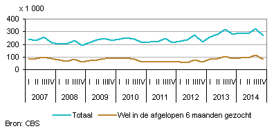 In het vierde kwartaal van 2014 waren er 266 duizend personen die betaald werk wilden voor twaalf uur of meer per week en hiervoor ook op korte termijn beschikbaar waren, maar die gedurende de afgelopen vier weken niet naar werk hadden gezocht. Van deze personen zochten er 81 duizend wel in de afgelopen zes maanden. Dit waren er 8 duizend minder dan in het vierde kwartaal van 2013. Het aandeel niet-actief zoekenden dat wel de afgelopen zes maanden had gezocht, lag hiermee op 30 procent. Dit aandeel is iets kleiner dan een jaar eerder in het vierde kwartaal.