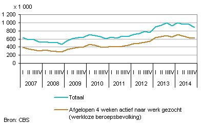 In het vierde kwartaal van 2014 behoorden 617 duizend personen tot de werkloze beroepsbevolking. Dit waren er 31 duizend minder dan een jaar eerder. In de eerste maanden van 2014 liep de werkloosheid weliswaar nog snel op, maar van mei tot en met augustus was er sprake van een scherpe daling. In het najaar stabiliseerde de werkloosheid, doordat meer mensen die voorheen geen deel uitmaakten van de beroepsbevolking, zich op de arbeidsmarkt begaven. In december nam de werkloosheid vervolgens weer iets toe.