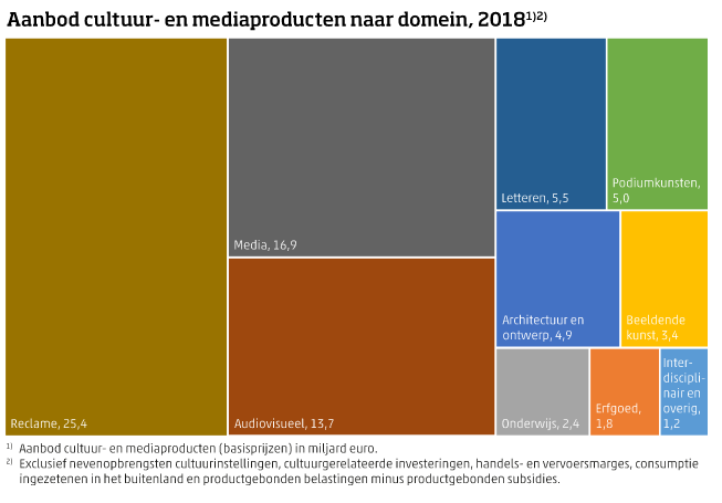 Het totale aanbod van cultuur- en mediaproducten bedroeg 80,1 miljard euro in 2018. Hierbinnen is het aanbod van reclame met 25,4 miljard euro (32 procent) het grootste. Cultuur- en mediaproducten in de domeinen media (radio, televisie, kranten en tijdschriften) en audiovisueel (film, video en overig audiovisueel) komen met respectievelijk 16,9 en 13,7 miljard euro op de tweede en derde plaats.