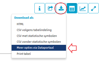 Er kunnen maximaal 20 duizend cijfers op het scherm getoond worden en je kunt maximaal 1 miljoen cijfers downloaden. Dit heeft vooral te maken met de wachttijd voor het laden van de gegevens; bij grotere aantallen kan die aanzienlijk oplopen. Grotere aantallen gegevens zijn alleen op te halen via het opendataportaal van StatLine. Binnen een tabel kunt u via de knop downloaden rechts boven de tabel altijd direct naar dezelfde tabel in het opendataportaal: