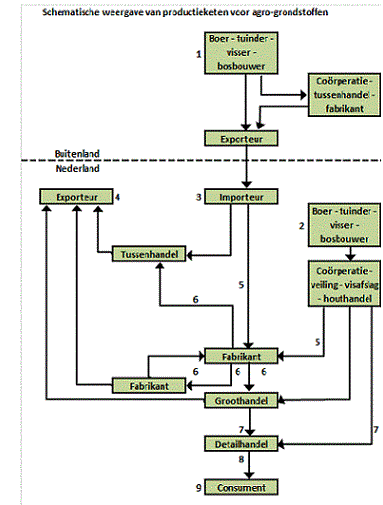 Exporteurs in het land van herkomst kopen vaak grote partijen op en verhandelen deze aan importeurs in andere landen, waaronder Nederland (3 import). In het land van bestemming worden de producten indien nodig door fabrikanten verder bewerkt/verwerkt tot halffabricaten of eindproducten. Fabrikanten in Nederland kunnen grondstoffen of halffabricaten uit Nederland of uit het buitenland betrekken (5 inkoop door fabrikanten). Na verwerking verkoopt de fabrikant de halffabricaten en eindproducten aan Nederlandse of buitenlandse bedrijven (6 verkoop binnen Nederland; 4 export). De detailhandelaren kopen producten van groothandelaren, de veiling of visafslag (7 inkoop door detailhandel) om ze vervolgens aan consumenten te verkopen (8 verkoop door detailhandel). De consument koopt producten via de detailhandel voor thuisgebruik, maar consumeert daarnaast ook buitenshuis zoals in restaurants, op kantoor en in sportkantines (9 consumptie).