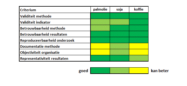 Alle bevindingen zijn naast elkaar gelegd en met elkaar vergeleken om tot een gewogen eindoordeel te komen. Onderstaand figuur geeft schematisch weer hoe de monitoring van de verschillende grondstoffen scoort op de criteria, op een kleurenschaal van goed (donkergroen) tot kan beter (geel). Een verantwoording van de scores in onderstaande figuur is te vinden op de pagina’s met aanvullende informatie over de criteria.