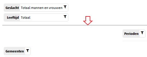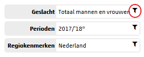 Door te klikken op het filter bij een variabele kunt u andere keuzes maken. Elke tabel kent een eigen, vooraf ingestelde presentatie. Deze laat over het algemeen maar een beperkt deel van de cijfers in een tabel zien. Het is mogelijk om die items te selecteren die u interessant vindt. U maakt dan gebruik van de filters.