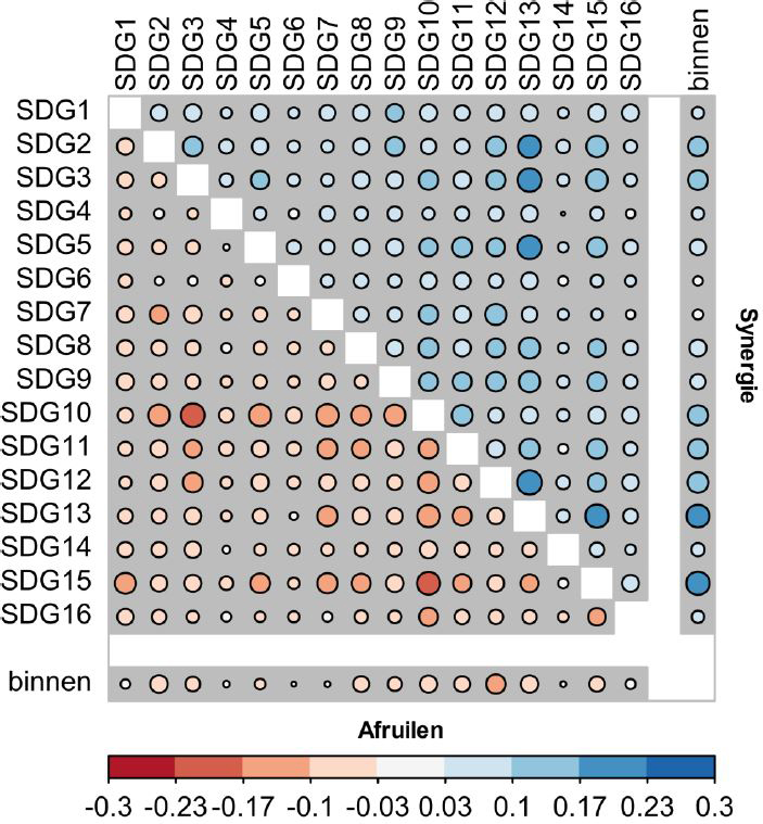 Er is sprake van verwachte synergie of afruil bij een co-integratietoets (1-p) van 0,90 of hoger. Een mogelijke synergie is weergegeven in het blauw, een mogelijke afruil in het rood. Aan de onderkant en de rechterkant van de visualisatie zijn respectievelijk de potentiële afruil en de potentiële synergie binnen SDG’s in een aparte rij en kolom weergegeven.