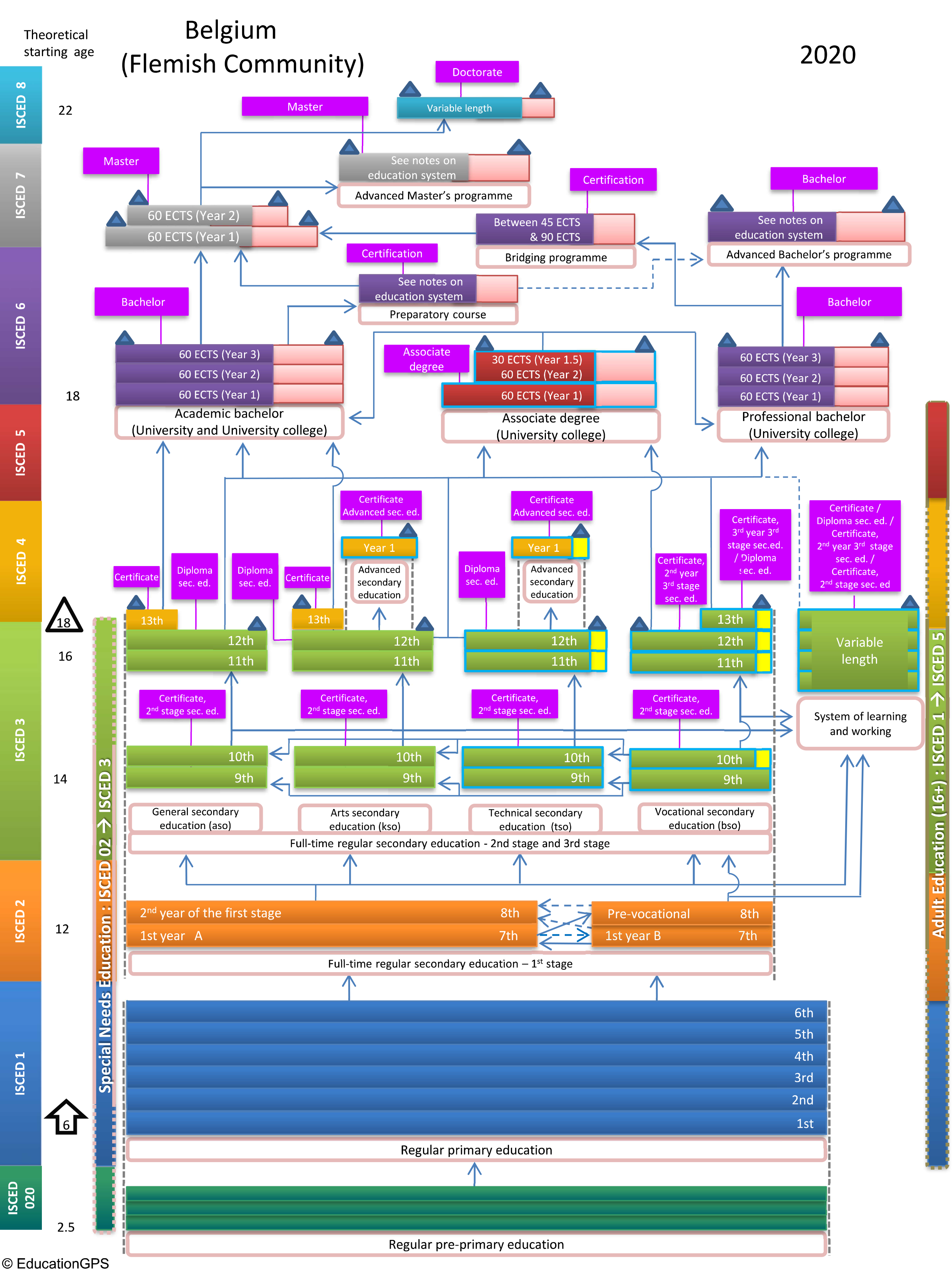 In Vlaanderen volgen kinderen vanaf leeftijd van 3 jaar eerst drie jaar gewoon kleuteronderwijs, daarna volgen ze tot de leeftijd van 12 jaar gewoon lager onderwijs. De fase die volgt op het lagere onderwijs wordt secundair onderwijs genoemd en is onderverdeeld in drie graden. Leerlingen beginnen in de eerste graad, dit is bedoeld als algemene vorming waar in het tweede jaar wordt voorgesorteerd op overstap naar de tweede graad. Vanaf leeftijd 14 jaar gaan leerlingen door naar de tweede graad en daarna derde graad, die ieder twee jaar duren en waarbinnen er wordt gedifferentieerd naar de volgende vier onderwijsvormen: