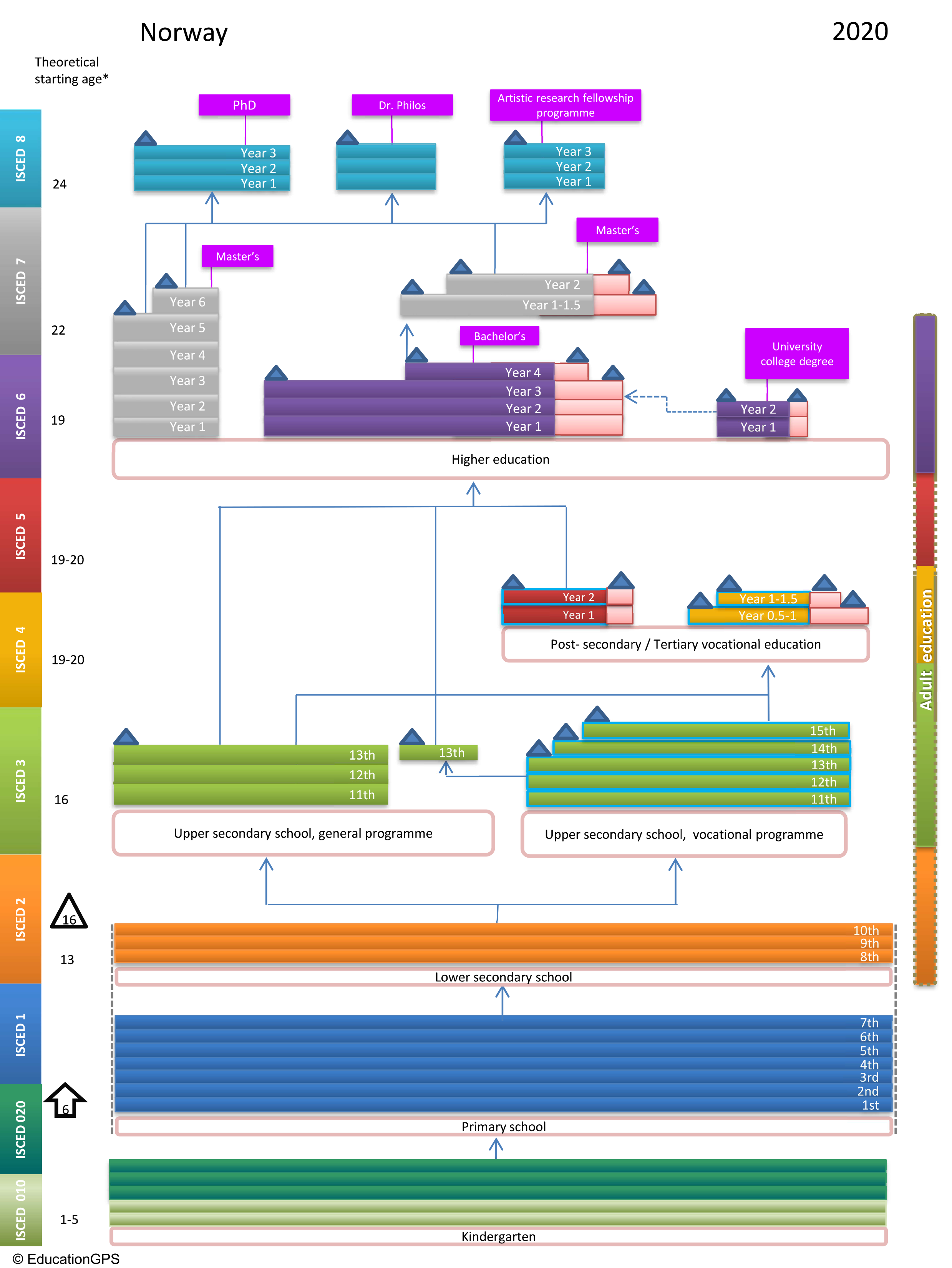 Figuur 3.4.2 Het onderwijssysteem in Noorwegen naar o.a. leeftijd, duur van de opleiding, gerichtheid (blauwe omranding staat voor beroepsgericht) en ISCED 2011 niveau van de opleiding. Zie bijlage 1 voor een uitgebreide toelichting op de betekenis van de symbolen en lijnopmaak.