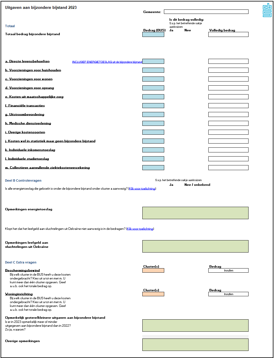 Alle berichtgevers hebben voor elke gemeente waarover zij rapporteren een vragenlijst ontvangen, waarin de uit de BUS-afgeleide bedragen over bijzondere bijstand reeds waren ingevuld per cluster. Het verzoek was om de opgegeven bedragen te controleren op juistheid en deze in geval van onjuistheid/onvolledigheid aan te vullen met de juiste bedragen bijzondere bijstand volgens de gemeentelijke administratie. In de bijlage is de vragenlijst weergegeven zoals verstuurd naar de berichtgevers.