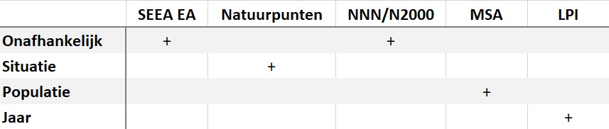 Bij het vergelijken van verschillende methoden is het essentieel om te evalueren hoe elke voldoet aan specifieke criteria die relevant zijn voor het ontwikkelen van een kernindicator ecosysteemkwaliteit (tabel 3.3). Zo is het bijvoorbeeld essentieel dat met de benodigde data een methode op landelijk niveau kan worden toegepast en op een hoge resolutie. Het schaalniveau van SEEA EA is het ecosysteemtype zelf en met onze ecosysteemtypekaart kan deze methode daarom makkelijk op landelijk en regionaal niveau worden toegepast. Het Natuurpuntensysteem gaat meer uit van de soorten die voorkomen, de zeldzaamheid en oppervlakte van het gebied. De NNN/Natura 2000 methode van Bij12 is breed ingesteld waarbij zowel gegevens van flora en fauna als structuur, waterkwaliteit en milieucondities en ruimtelijke samenhang worden gebruikt. De methode is echter per definitie gefocust op natuurgebieden, en in de huidige vorm niet direct in te zetten voor meer artificiële ecosystemen zoals landbouwgebieden of stedelijke gebieden. De MSA-methode is een methode om de mate van afname in biodiversiteit te meten. Door de focus op biodiversiteit en het gebrek aan data zal de methode in de praktijk minder geschikt zijn om ecosysteemkwaliteit landelijk te meten door gebrek aan data in stedelijke gebieden. De LPI-methode berekent een ongewogen gemiddelde trend van alle soorten in een bepaald gebied.