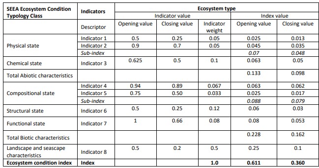 Om ten slotte de overkoepelende kwaliteitsindicator te berekenen, worden alle sub-indices gecombineerd. Dit kan worden gedaan door de gemiddelde waarden van de sub-indices te nemen of door een andere methode te gebruiken, afhankelijk van de gewichten die aan elk ecosysteemtype zijn toegewezen. In Tabel 3.1 is een voorbeeld te zien van een ecosysteemkwaliteit rekening met genormaliseerde indicatoren en sub-indices volgens de SEEA EA methode.