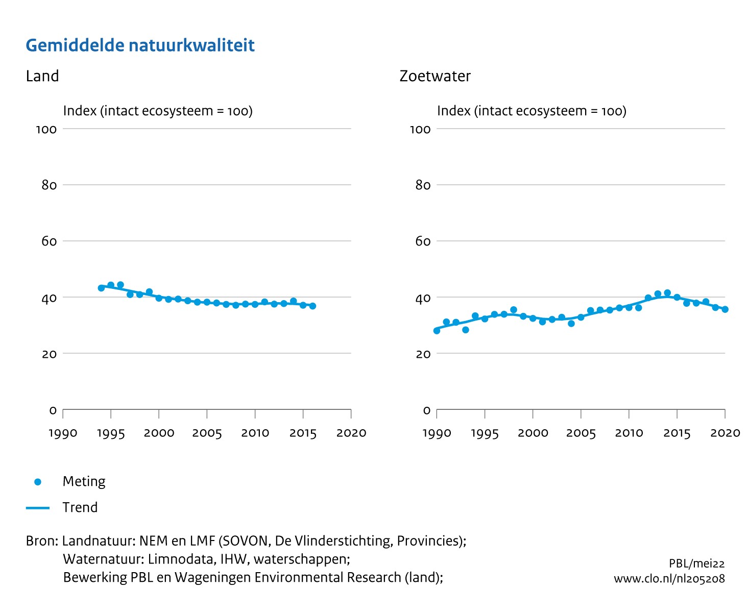 Figuur 3.6. Trends in de kwaliteit van landnatuur en water, uitgedrukt door middel van de MSA.