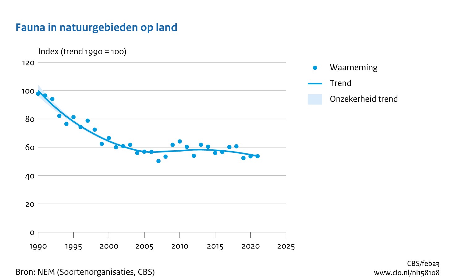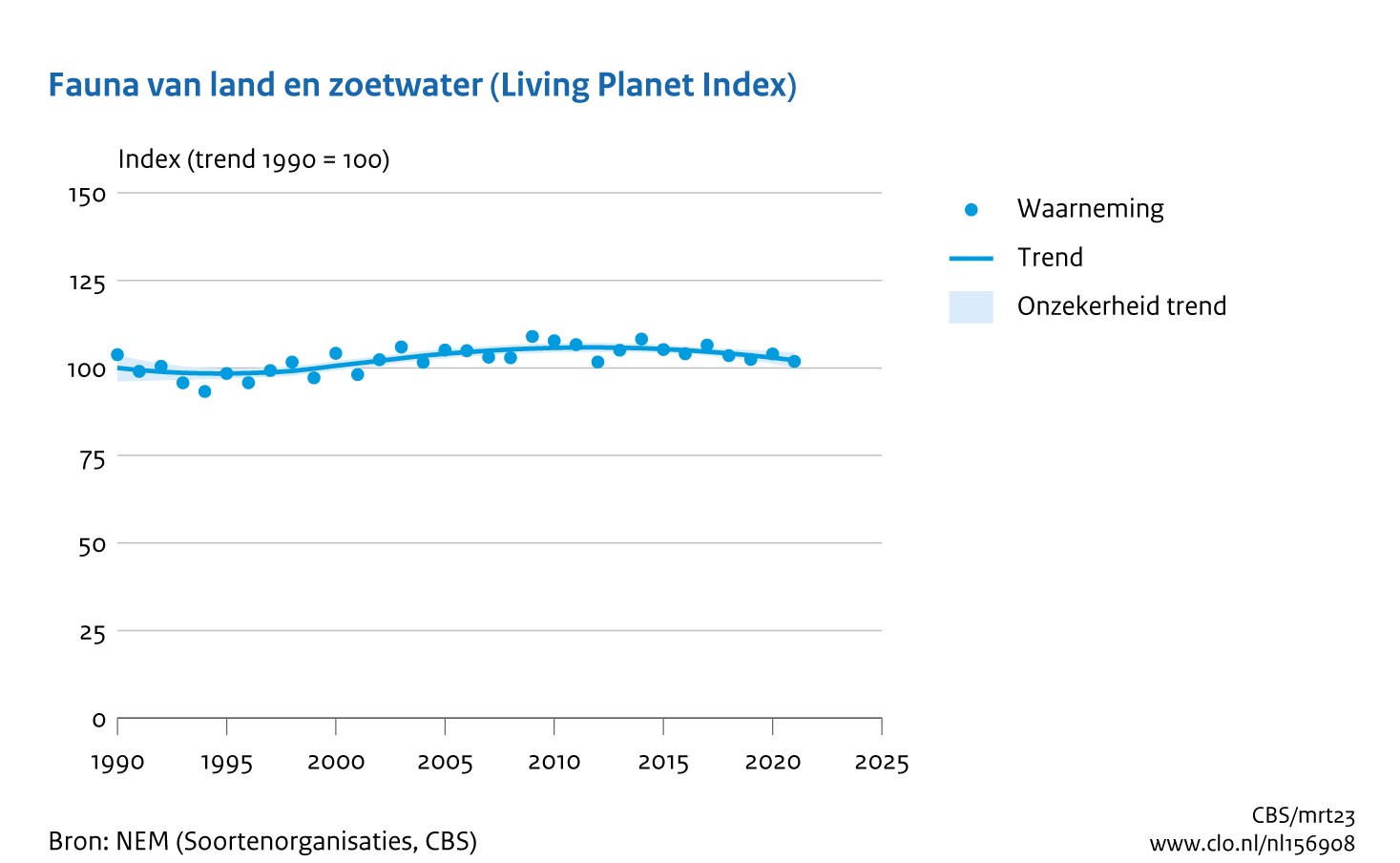 Het CBS publiceert indicatoren over de trends in aantal en/of verspreiding van verschillende soortgroepen, al dan niet uitgesplitst per habitat. Hierbij wordt gebruik gemaakt van de Living Planet Index (LPI) methode (CBS et al., 2024a), die aansluit bij de gelijknamige methodiek zoals die internationaal door het Wereld Natuurfonds wordt gebruikt (Loh et al, 2015).