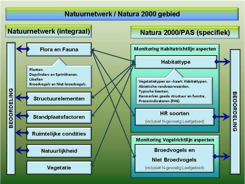 Figuur 3.2. Een schematische visualisatie van de samenhang tussen de monitoring voor het Natuurnetwerk (integrale beoordeling) en de Natura 2000 aanpak (beoordeling van specifieke doelen) (Bij12, 2021a).