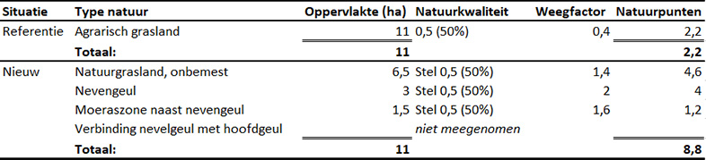 Tabel 3.2. Berekening van de natuurpunten voor een fictief voorbeeld waarbij een stukje uiterwaard in gebruik als agrarisch grasland wordt omgezet in een nevengeul en natuurgebied. Aangepast naar van Gaalen en al., (2014), hun tabellen 8.1. en 8.2. Uitgedrukt in natuurpunten verviervoudigd de natuurkwaliteit door deze maatregel.