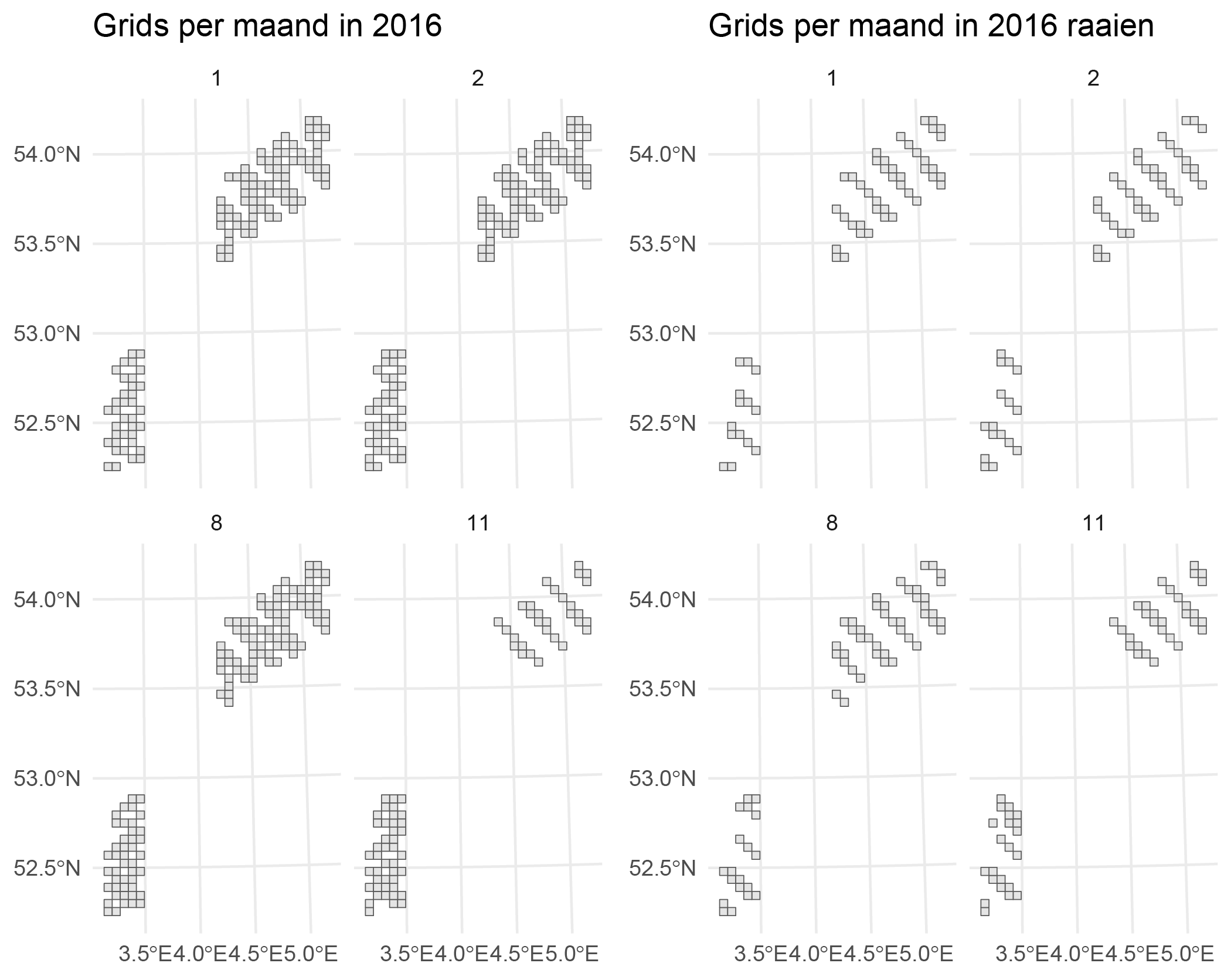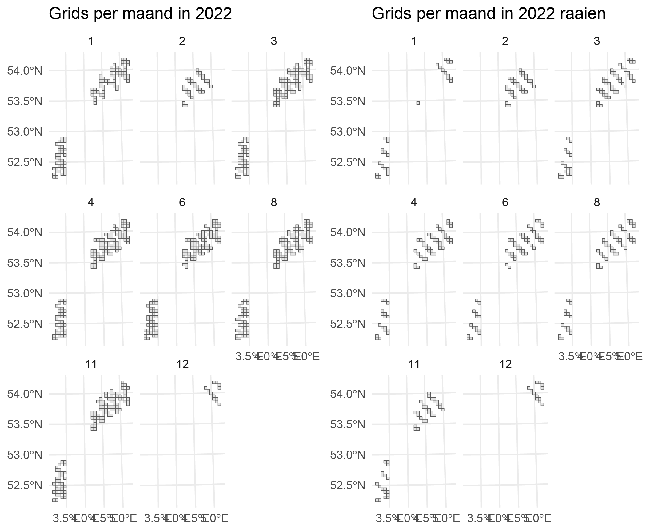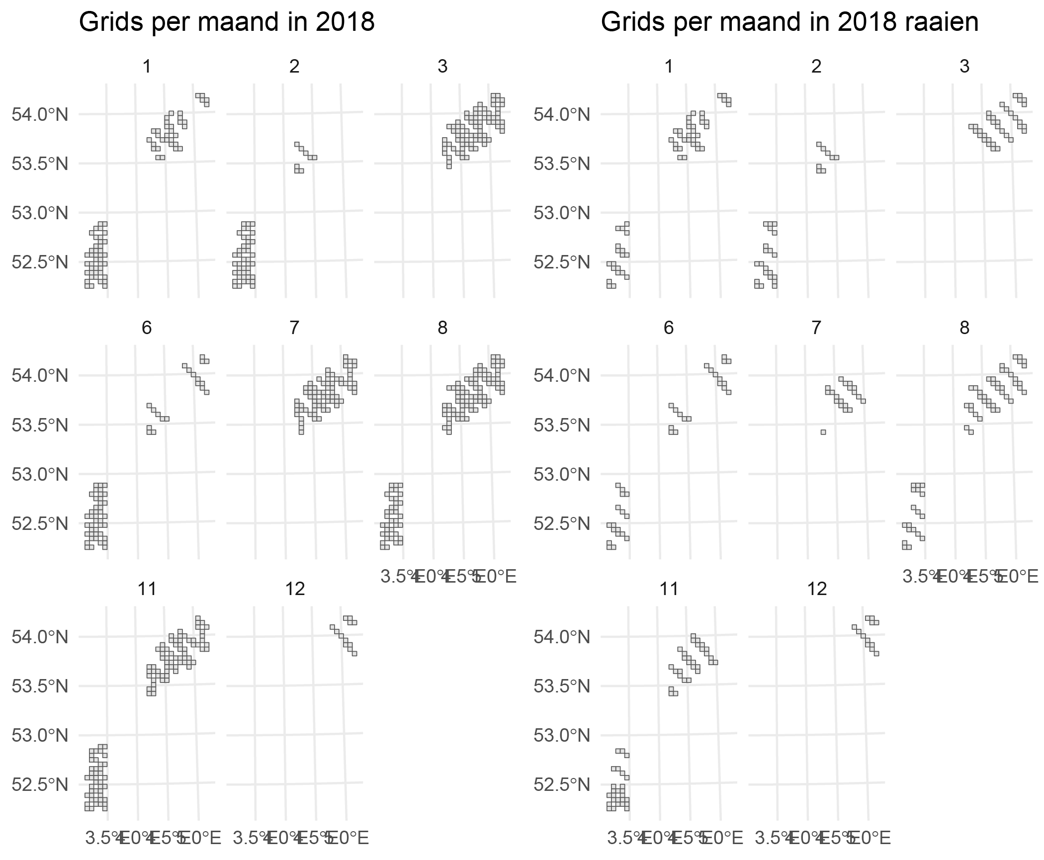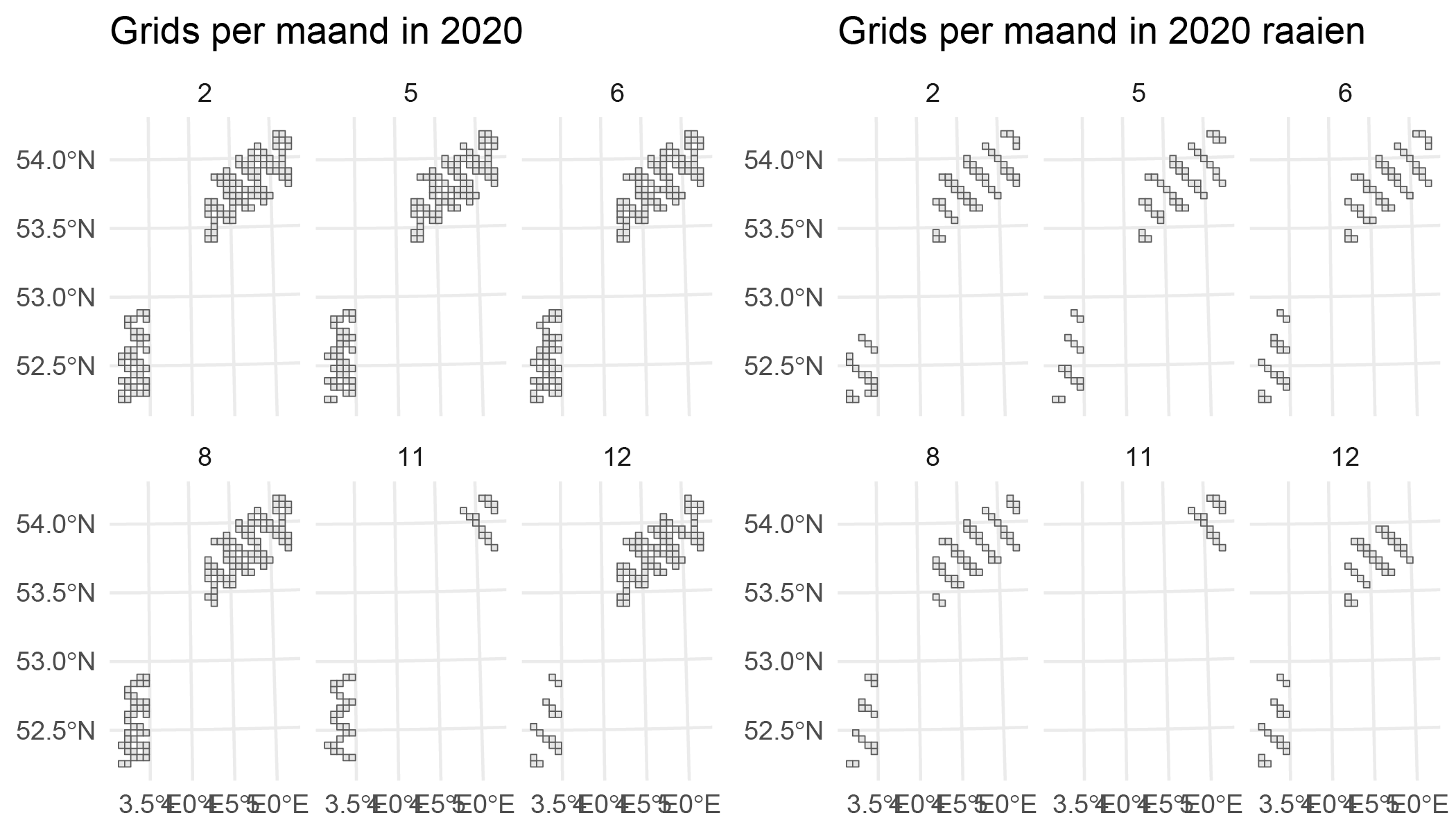 De hoeveelheid bemonsterde grids per tweemaandperiode en per telseizoen voor de twee gebieden is weergegeven in Figuur 2.3, zowel voor de volledige dataset als voor alleen de vaste raaien. Door de extra tellingen niet mee te nemen, wordt gemiddeld per telseizoen ~55% minder bemonsterd op de Bruine Bank en ~45% minder op het Friese Front. Voor de volledige dataset is het voorjaar (maart tot en met juni) van 2014 tot en met 2016 niet bemonsterd, en is de tweemaandperiode sep/okt in de afgelopen 10 jaar nooit bemonsterd.