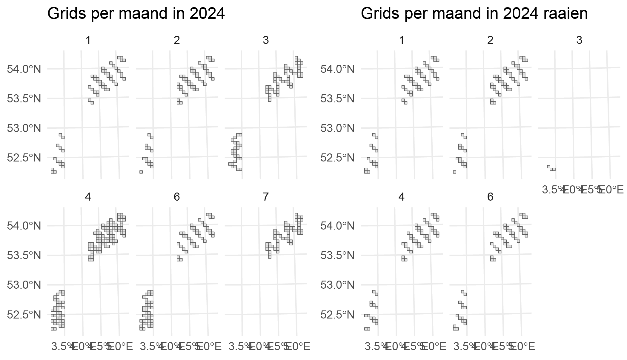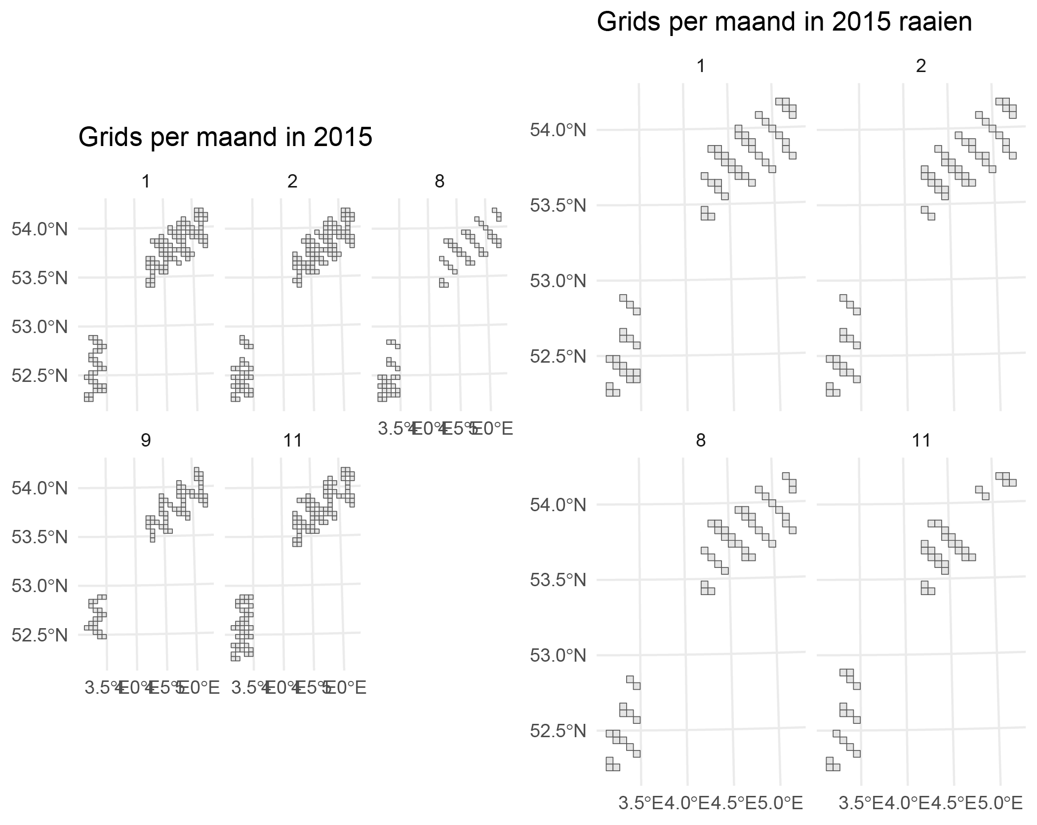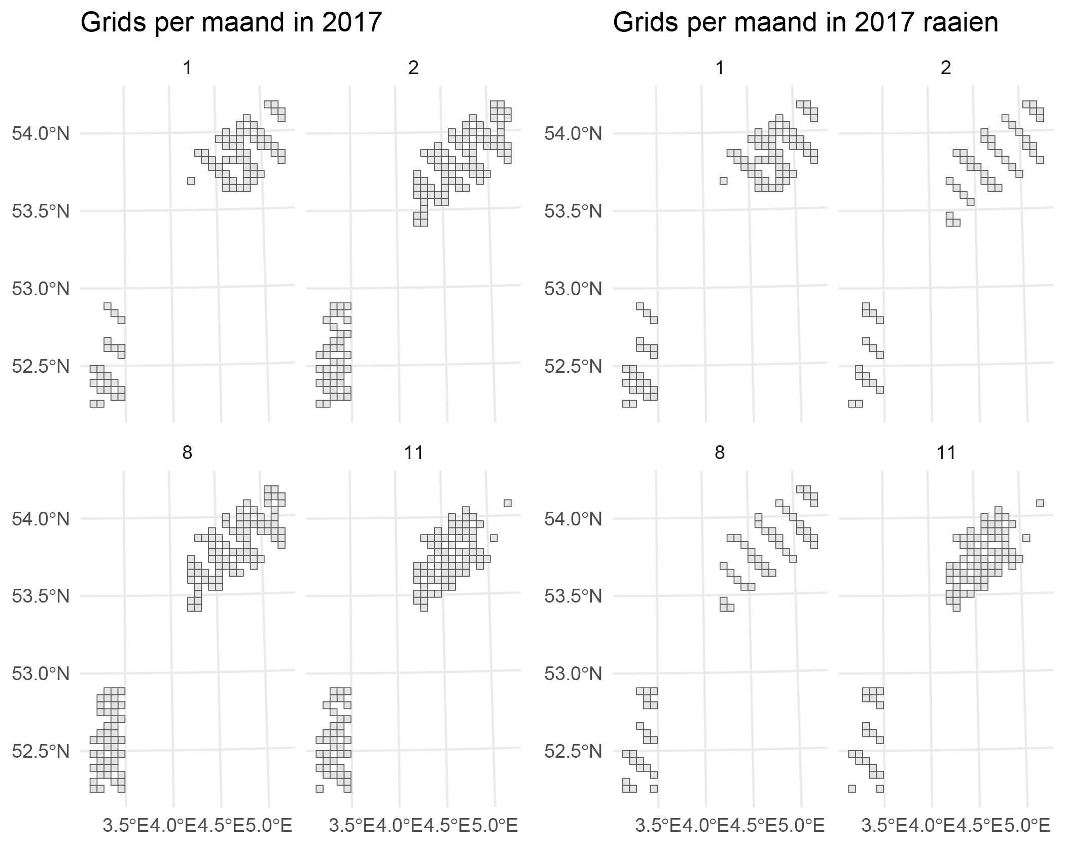 De hoeveelheid bemonsterde grids per tweemaandperiode en per telseizoen voor de twee gebieden is weergegeven in Figuur 2.3, zowel voor de volledige dataset als voor alleen de vaste raaien. Door de extra tellingen niet mee te nemen, wordt gemiddeld per telseizoen ~55% minder bemonsterd op de Bruine Bank en ~45% minder op het Friese Front. Voor de volledige dataset is het voorjaar (maart tot en met juni) van 2014 tot en met 2016 niet bemonsterd, en is de tweemaandperiode sep/okt in de afgelopen 10 jaar nooit bemonsterd.