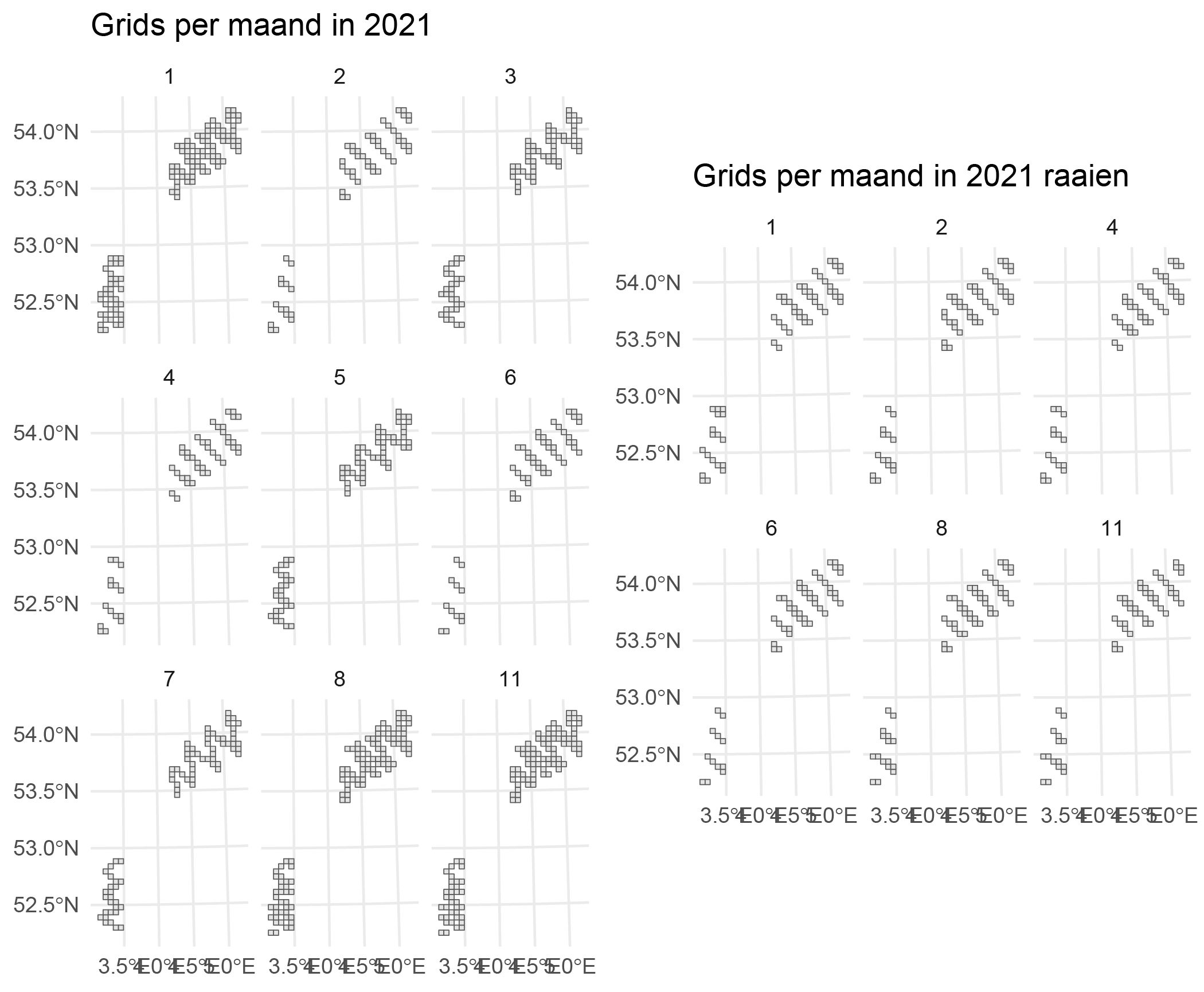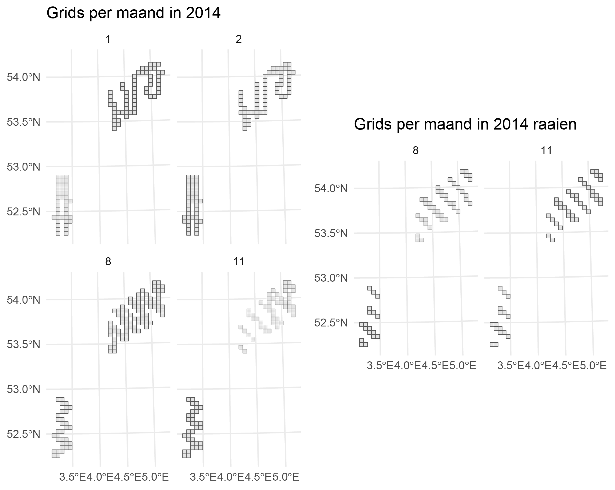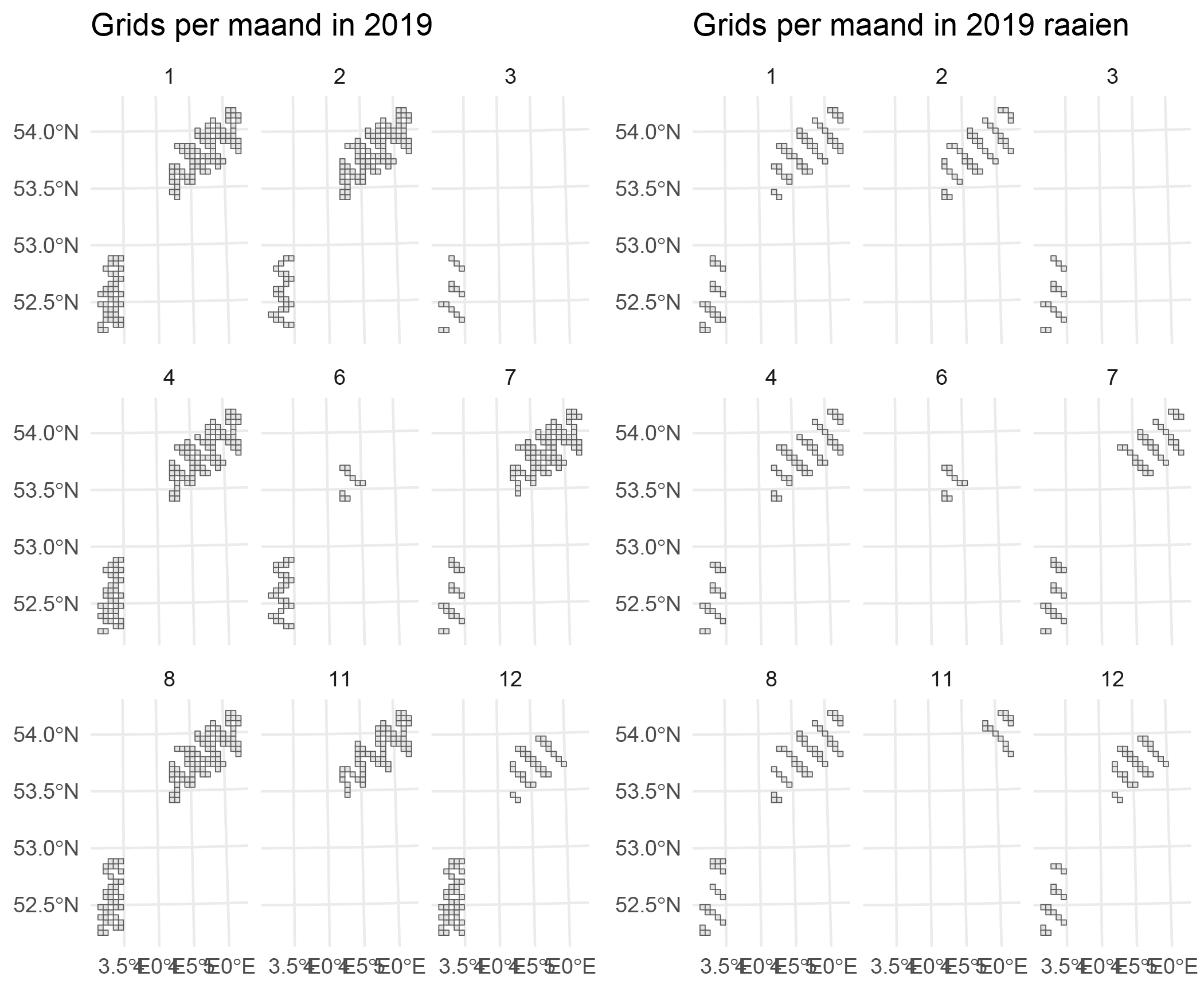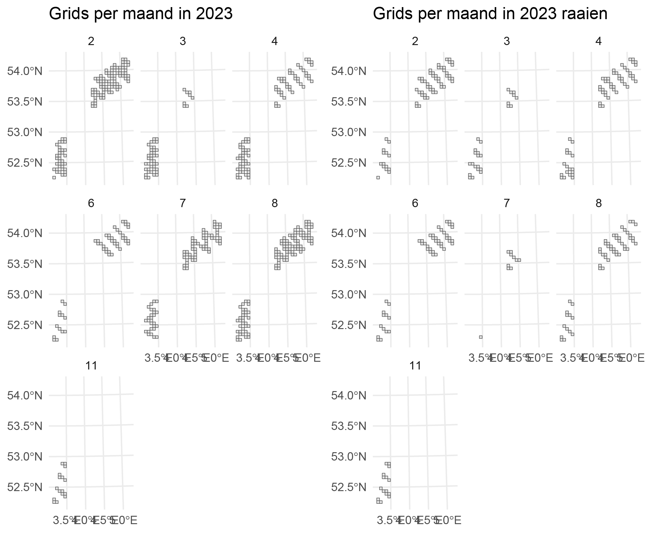 De hoeveelheid bemonsterde grids per tweemaandperiode en per telseizoen voor de twee gebieden is weergegeven in Figuur 2.3, zowel voor de volledige dataset als voor alleen de vaste raaien. Door de extra tellingen niet mee te nemen, wordt gemiddeld per telseizoen ~55% minder bemonsterd op de Bruine Bank en ~45% minder op het Friese Front. Voor de volledige dataset is het voorjaar (maart tot en met juni) van 2014 tot en met 2016 niet bemonsterd, en is de tweemaandperiode sep/okt in de afgelopen 10 jaar nooit bemonsterd.