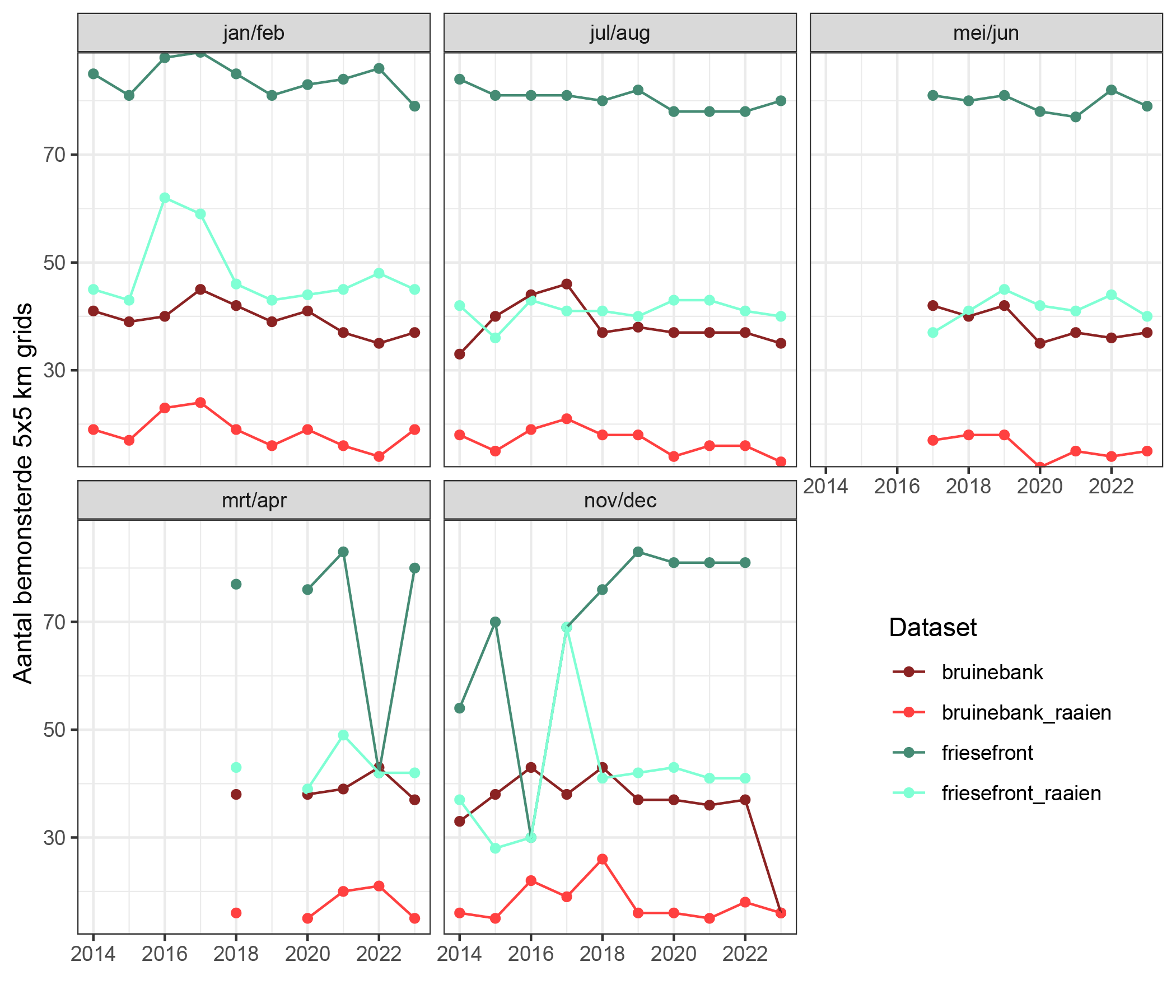 2.3 Het aantal bemonsterde 5x5 km grids per tweemaandperiode van telseizoen 2014 tot en met 2023 voor de volledige dataset van de Bruine Bank en het Friese Front, en voor alleen de raaien (zonder extra telinspanning) per gebied.