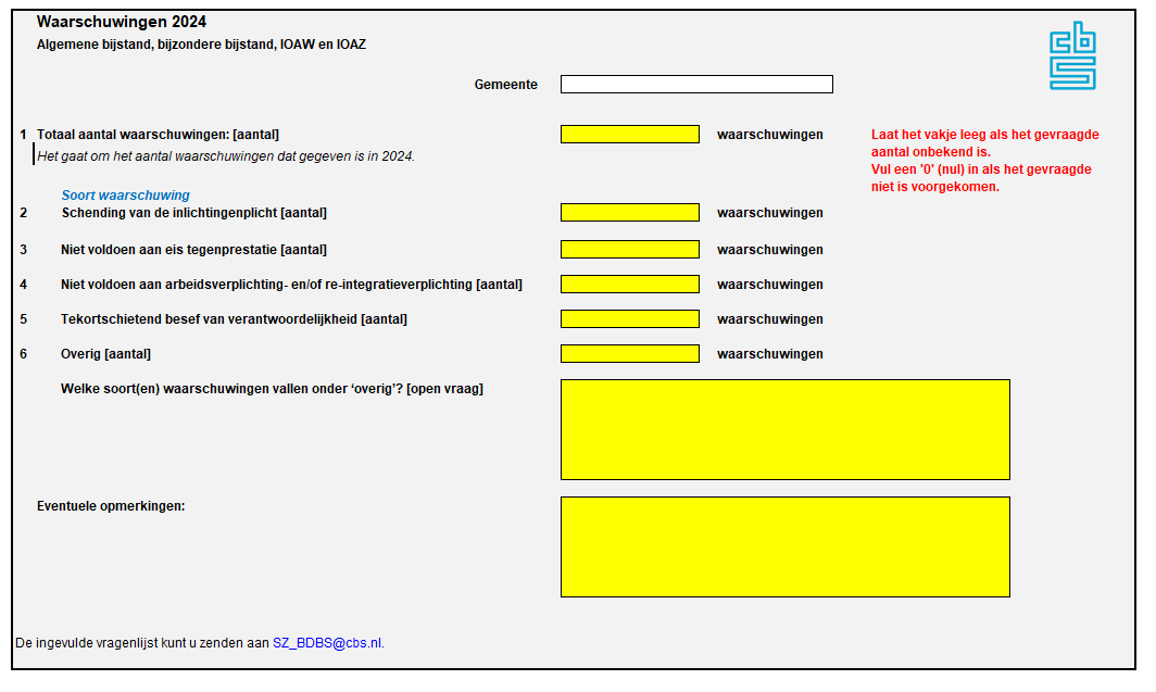 Het aantal gegeven waarschuwingen wordt niet uitgevraagd in de Bijstandsdebiteuren- en boetestatistiek (BDBS)2) of de Bijstandsuitkeringenstatistiek (BUS). Daarom heeft het CBS vanaf 2017 jaarlijks een enquête uitgezet bij gemeenten om inzicht te krijgen in het aantal waarschuwingen dat vanaf verslagjaar 2016 is afgegeven. Dit onderzoek is in 2025 herhaald voor het verslagjaar 2024.