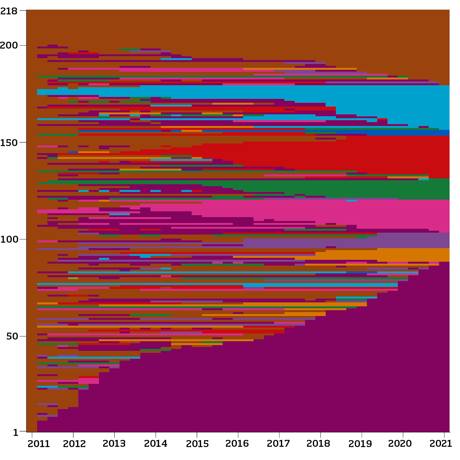 Figuur 5.1 Individuele loopbaanpaden van de branche sociaal werk, 2011-2021