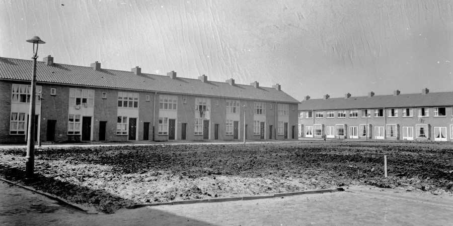 Gezicht op enkele nieuwbouwwoningen in de wijk Slotervaart te Amsterdam, 1956.