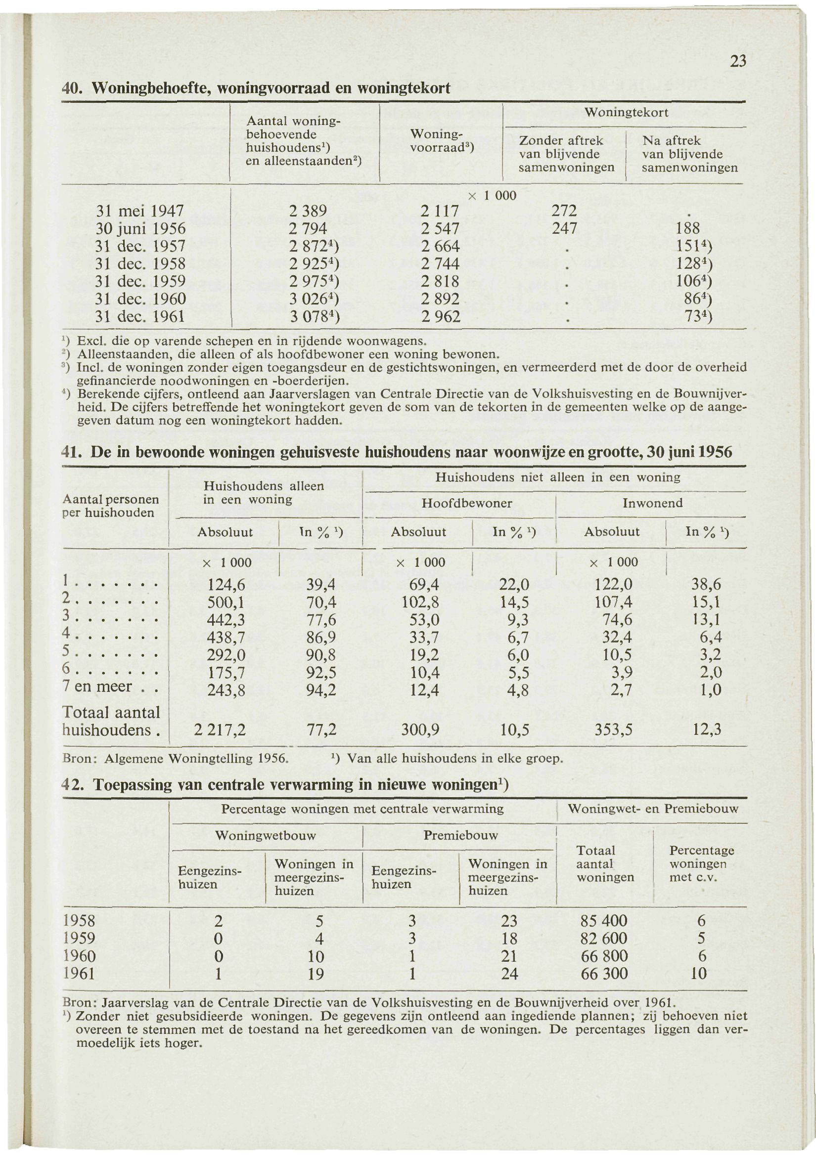 In 1947 werd er een volkstelling en een woningtelling gehouden om de woningvoorraad in kaart te brengen. Ook in 1956 was er een woningtelling, dit keer zonder volkstelling. In deze telling werd onder andere gekeken naar elektriciteitsaansluitingen, het aantal slaapruimten en alleenstaande bewoners. De woningnood was in die jaren een van de belangrijkste politieke thema’s. In 1956 was het woningtekort ongeveer 188 duizend woningen, oftewel 7,4 procent van de woningvoorraad. Als huishoudens die vrijwillig samenwoonden worden meegerekend, was het tekort zelfs 247 duizend woningen (9,7 procent). In 1960 leidde een conflict over woningbouw tot een kabinetscrisis (‘de Bouwcrisis’).
