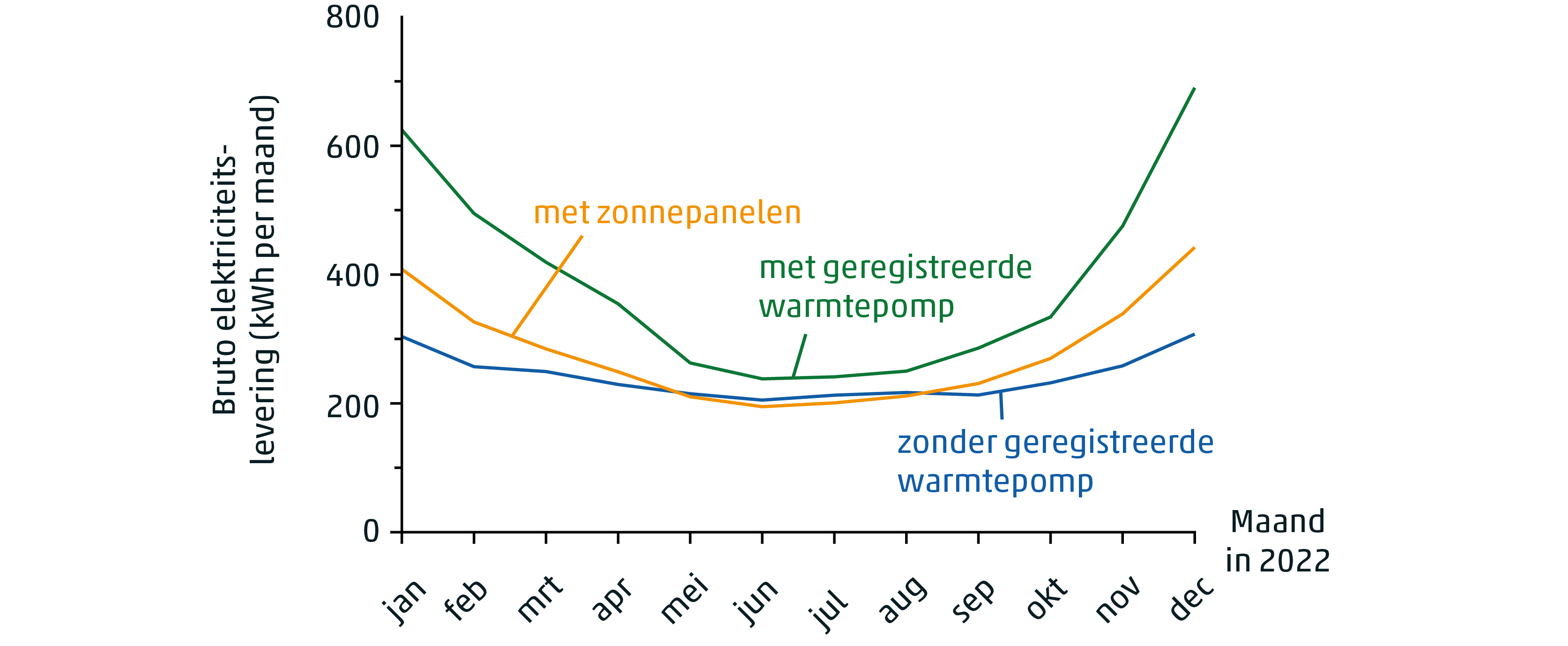 Bruto elektriciteitslevering voor huishoudens met of zonder geregistreerde warmtepompinstallatie en huishoudens met zonnepanelen per maand in 2022.