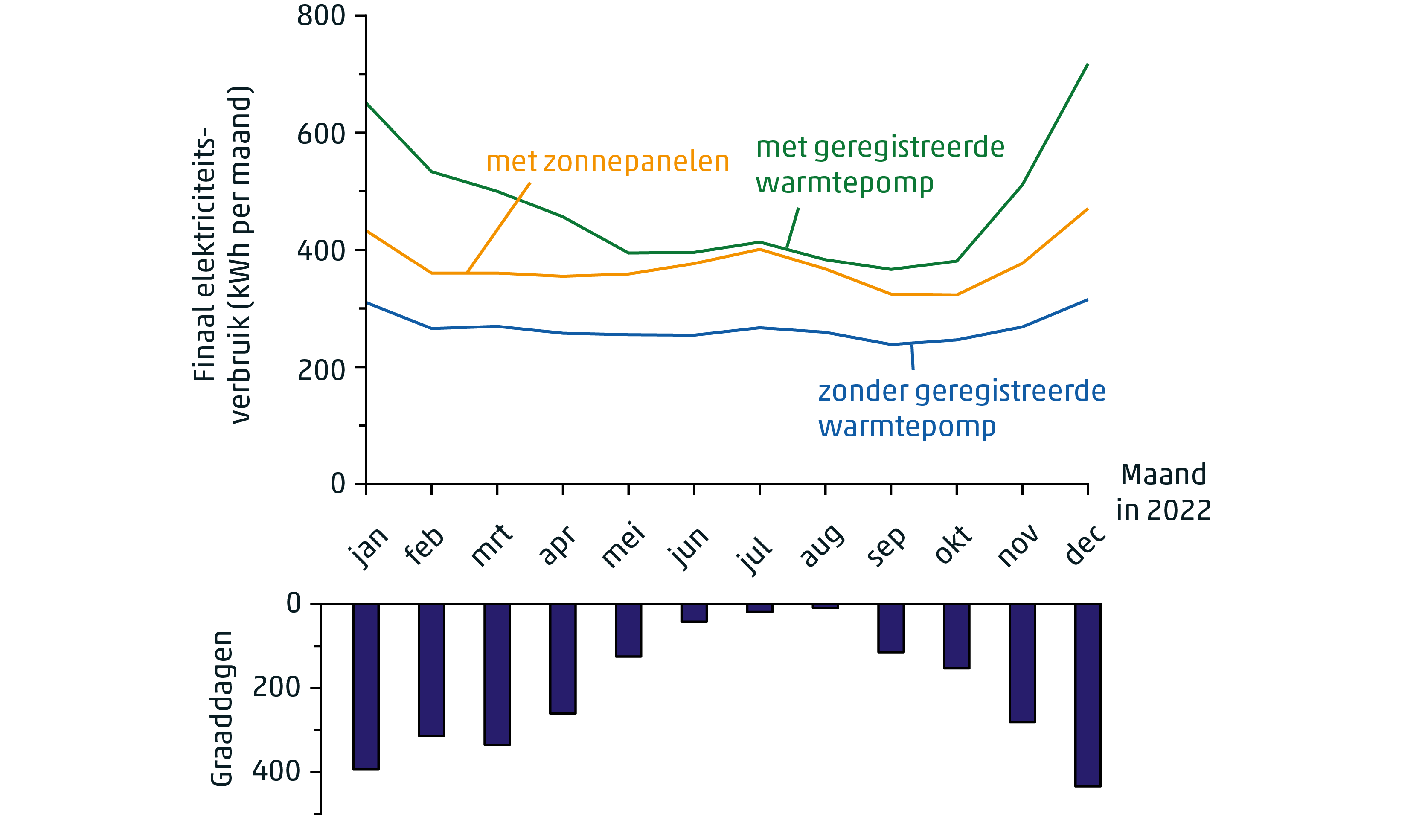 Het finaal elektriciteitsverbruik voor huishoudens met of zonder geregistreerde warmtepompinstallatie en huishoudens met zonnepanelen per maand in 2022. Ter vergelijking is het aantal maandelijkse graaddagen in de betreffende maanden weergegeven.