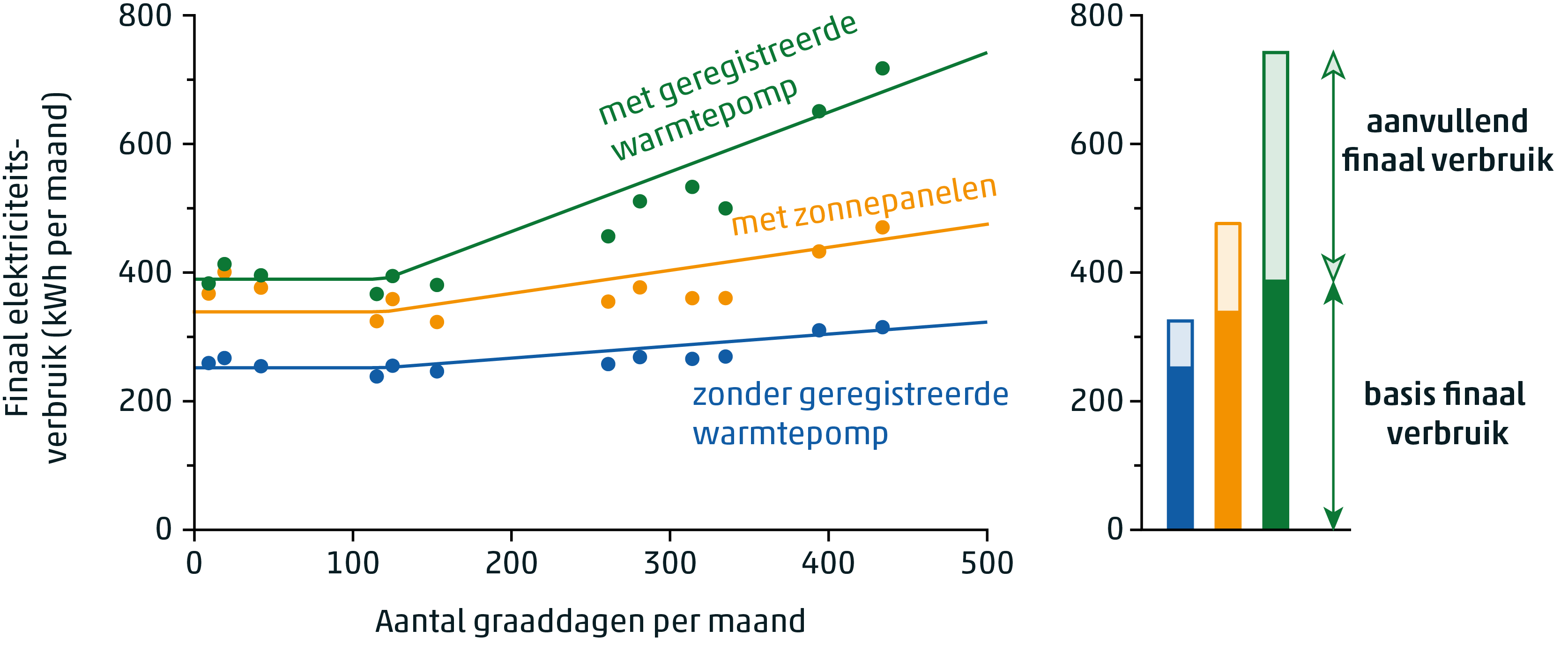 Het finaal elektriciteitsverbruik als functie van het aantal graaddagen per maand voor huishoudens met of zonder geregistreerde warmtepompinstallatie en huishoudens met zonnepanelen. Het finaal elektriciteitsverbruik bestaat uit een basis finaal verbruik en een seizoensafhankelijk aanvullend finaal verbruik.