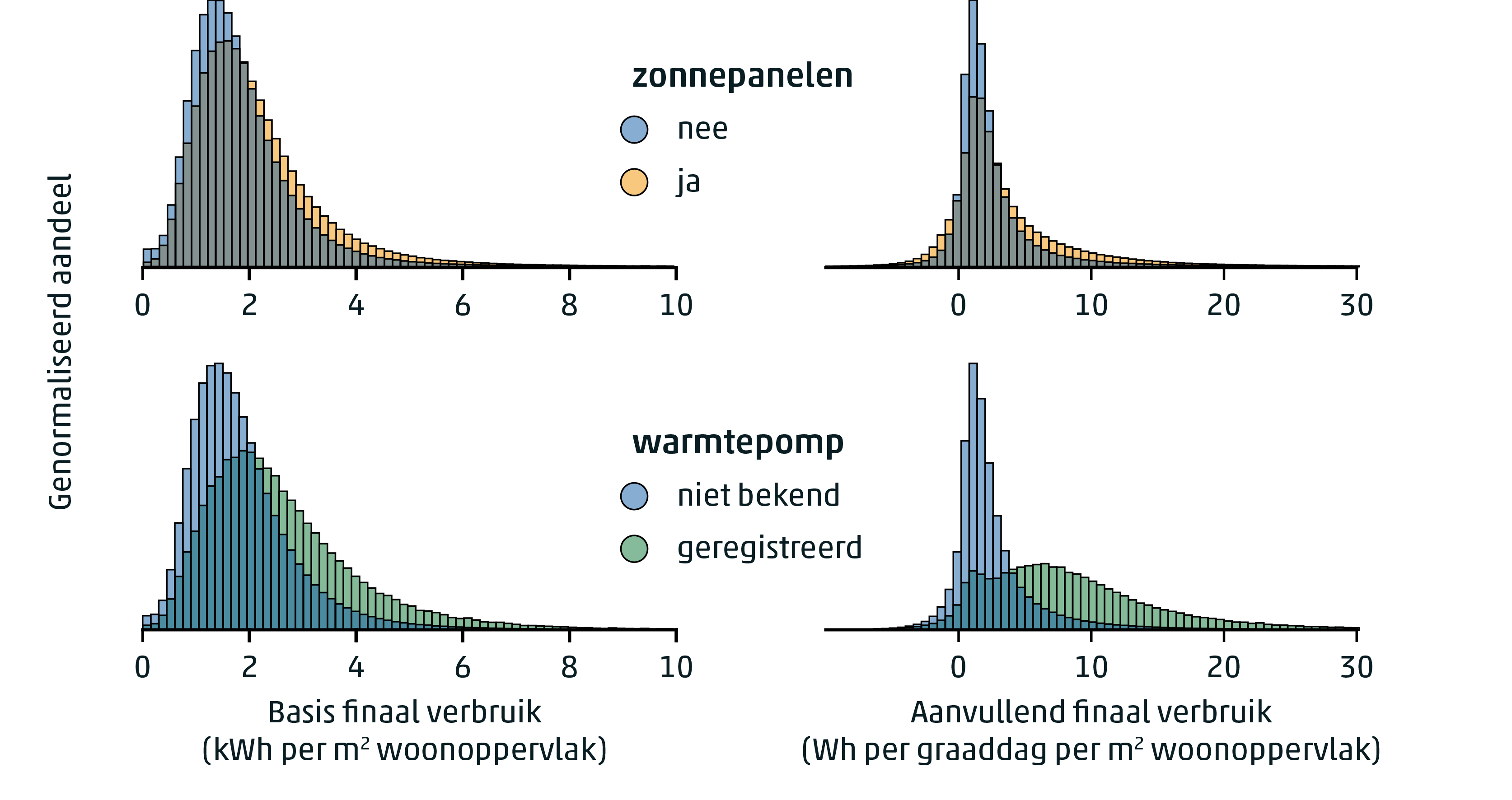De verdelingen van het basis- en aanvullend finaal verbruik van elektriciteit voor woningen met of zonder zonnepanelen (boven) en voor woningen met of zonder geregistreerde warmtepompinstallatie (onder).