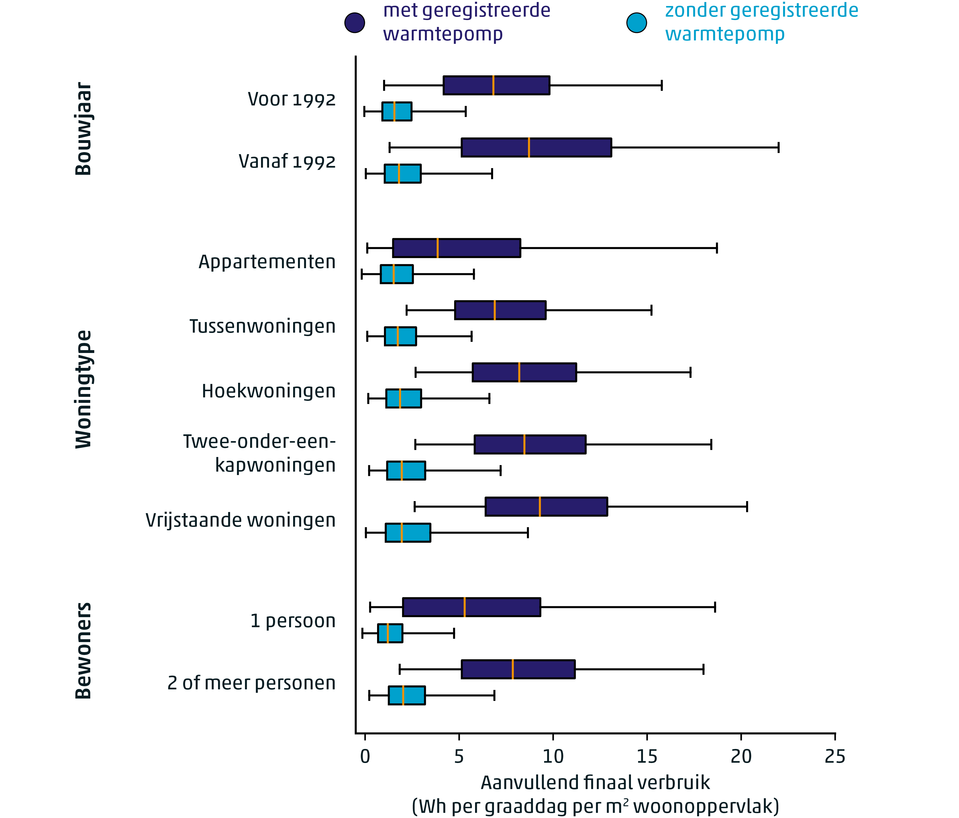 Spreiding van het aanvullend finaal verbruik voor woningen met uitsplitsingen op basis van kenmerken als bouwjaar, woningtype, en bewonersaantal. De verdelingen zijn weergegeven als balkjes, die het gedeelte van de populatie tussen het 30e en 70e percentiel weergeven. De mediaan is weergegeven als een gele streep. Het 10e en 90e percentiel zijn weergegeven als uitstekende staafjes. Per woningkenmerk is de verdeling van woningen met geregistreerde warmtepomp (donkerblauw) en zonder geregistreerde warmtepomp (lichtblauw) weergegeven.