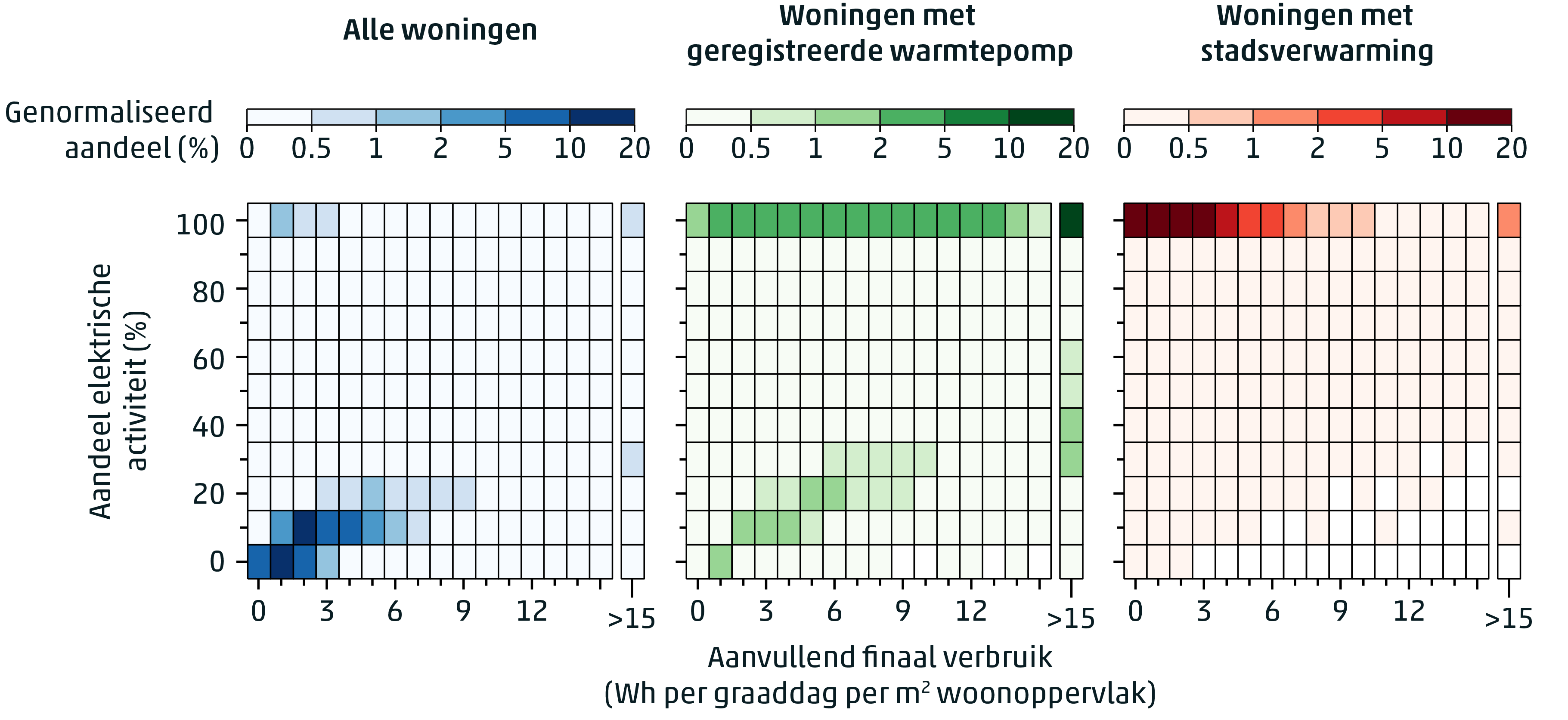 waarbij het elektriciteitsverbruik en gasverbruik beiden worden omgerekend naar een equivalent in GJ. Van het finaal elektriciteitsverbruik wordt alleen het aanvullende, seizoensafhankelijke, gedeelte meegenomen. Voor aardgas nemen we het volledige verbruik en hanteren we een stookwaarde van 31,65 MJ/m3. Let op dat energieverbruik in de vorm van warmteleveringen (over deze data heeft het CBS geen beschikking) niet wordt meegeteld. Een stadswarmtewoning zonder aardgasverbruik heeft daarmee per definitie een aandeel elektrische activiteit van 100 procent, net als een all-electric woning. Figuur 3.3 toont in twee dimensies de verdeling van het aanvullend finaal elektriciteitsverbruik, en het aandeel van de elektrische activiteit voor drie groepen: alle woningen, woningen met een geregistreerde warmtepomp en woningen met stadsverwarming. Opvallend is dat de meest voorkomende woning vaak nog gasgestookt is, waardoor je in het plaatje met alle woningen vooral veel woningen met een laag aandeel elektrische activiteit ziet. Het aanvullend finaal elektriciteitsverbruik ligt daarbij typisch onder de 3 Wh per graaddag per vierkante meter woonoppervlak. Woningen met een geregistreerde warmtepomp of stadsverwarming zijn minder afhankelijk van aardgas, met een aandeel elektrische activiteit tegen de honderd procent. Woningen met stadsverwarming hebben echter vaker een laag aanvullend elektriciteitsverbruik, terwijl dat verbruik hoog is voor woningen met geregistreerde warmtepomp.