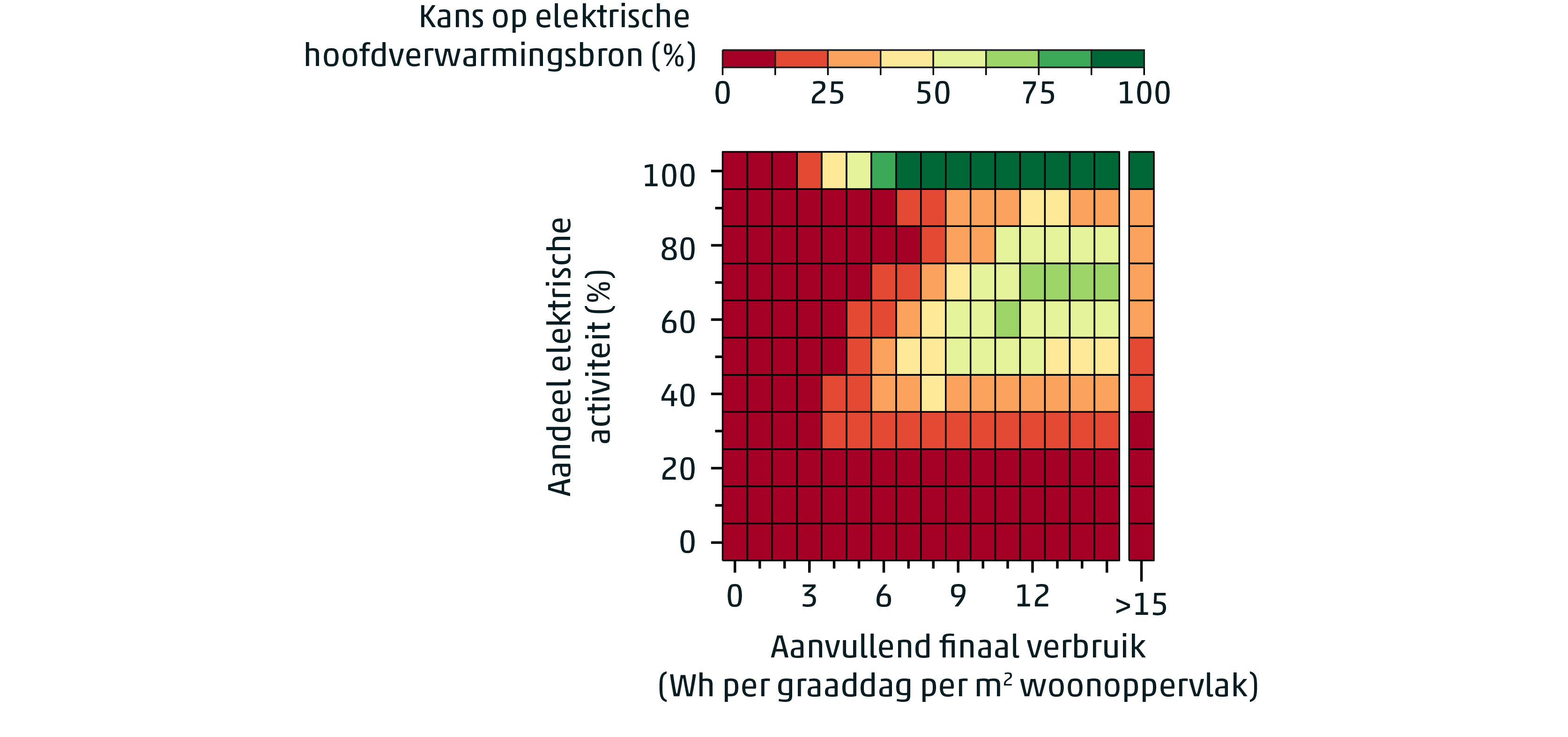 De kans op het aantreffen van een elektrische hoofdverwarmingsinstallatie per combinatie van het aanvullend finaal verbruik en het aandeel elektrische activiteit. Deze kans is afhankelijk van het totaal aantal verwachte elektrische hoofdverwarmingsinstallaties in de populatie.