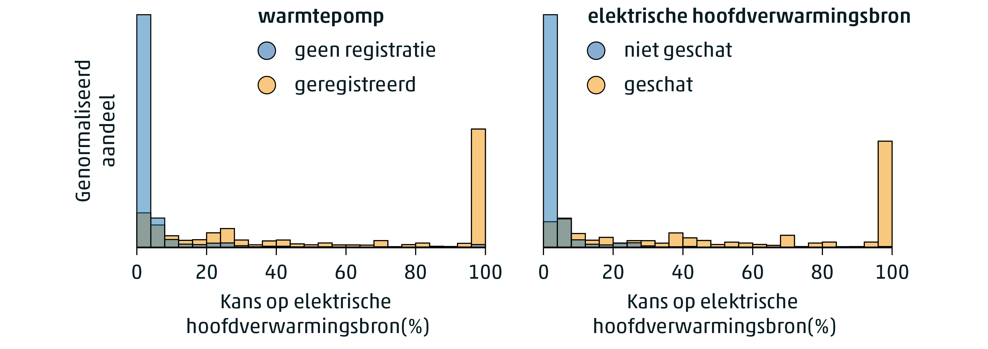 Het linker paneel in Figuur 5.2 toont de kans op de aanwezigheid van een elektrische hoofdverwarmingsbron, voor woningen met een geregistreerde warmtepompinstallatie en voor woningen zonder registratie. Woningen met een geregistreerde warmtepomp krijgen op basis van seizoenspatronen in hun elektriciteitsverbruik in de meeste gevallen een kans van (bijna) 100 procent op de aanwezigheid van een elektrische hoofdverwarmingsbron. Voor een deel van de woningen is die kans lager omdat hun verbruik minder typerend is, wat mogelijk het geval is voor hybride warmtepompen die naast elektriciteit ook aardgas gebruiken voor ruimteverwarming. Daarnaast kan er bij woningen die met een collectieve warmtepomp verwarmd worden geen individueel seizoenspatroon worden herkend, waardoor ook zij een lage(re) kans krijgen voor de aanwezigheid van een elektrische hoofdverwarmingsbron.
