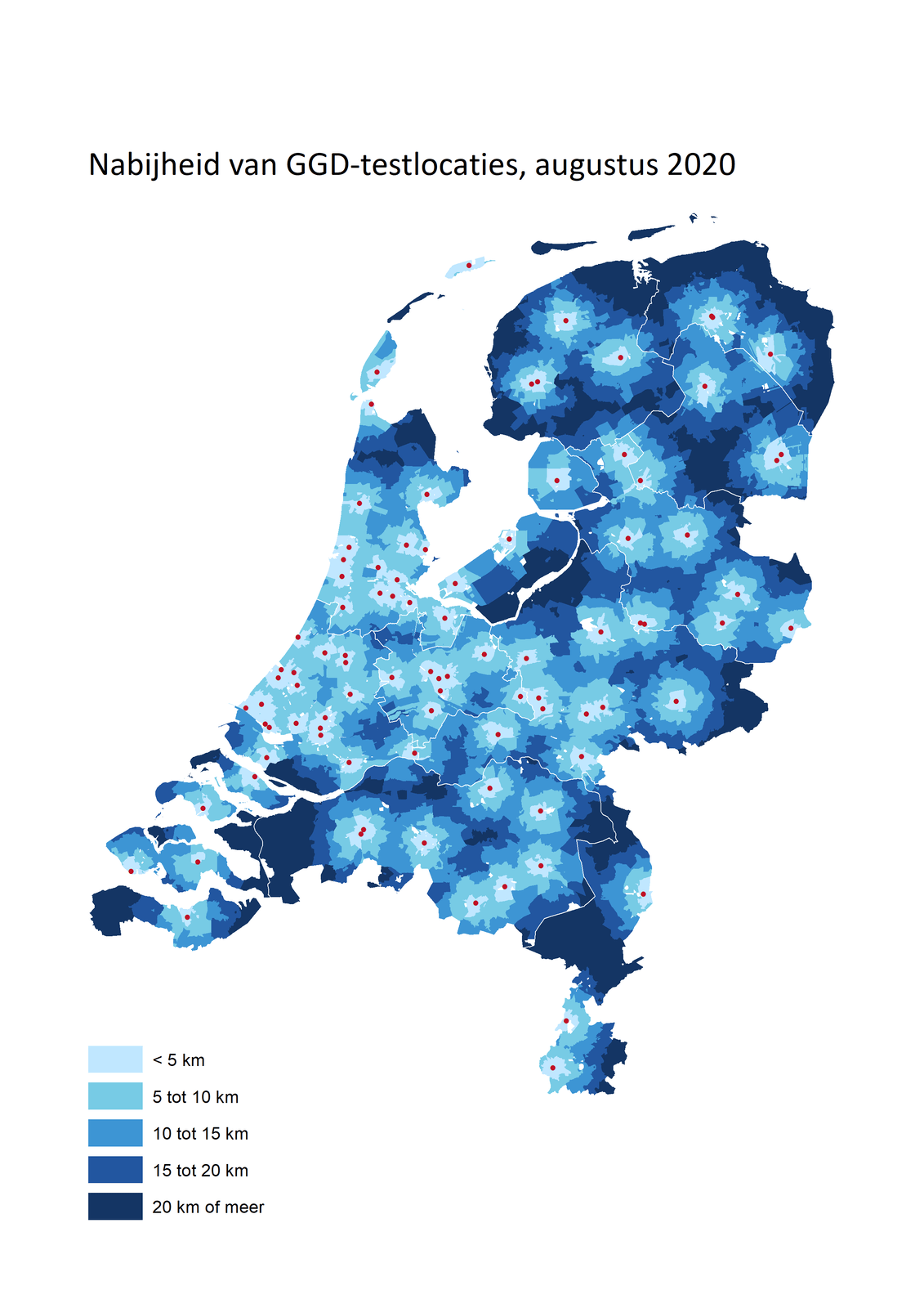 In augustus 2020 was de gemiddelde afstand over de weg vanaf elk adres in Nederland tot de dichtstbijzijnde GGD-testlocatie 8,7 kilometer. Omdat in de daaropvolgende maanden meer GGD-testlocaties werden geopend, was deze afstand in januari 2021 29 procent kleiner (6,2 kilometer). Limburg was de provincie waar de afstand tot de dichtstbijzijnde GGD-teststraat met 55 procent het sterkst daalde, van 15,1 kilometer in augustus 2020 tot 6,9 kilometer in januari 2021. In Noord- en Zuid-Holland, waar de afstanden tot de testlocaties al relatief kort waren, was de daling minder groot: in Noord-Holland nam de afstand af van 5,6 kilometer in augustus 2020 tot 4,7 kilometer in januari 2021, en in Zuid-Holland van 5,8 kilometer tot 4,9 kilometer.