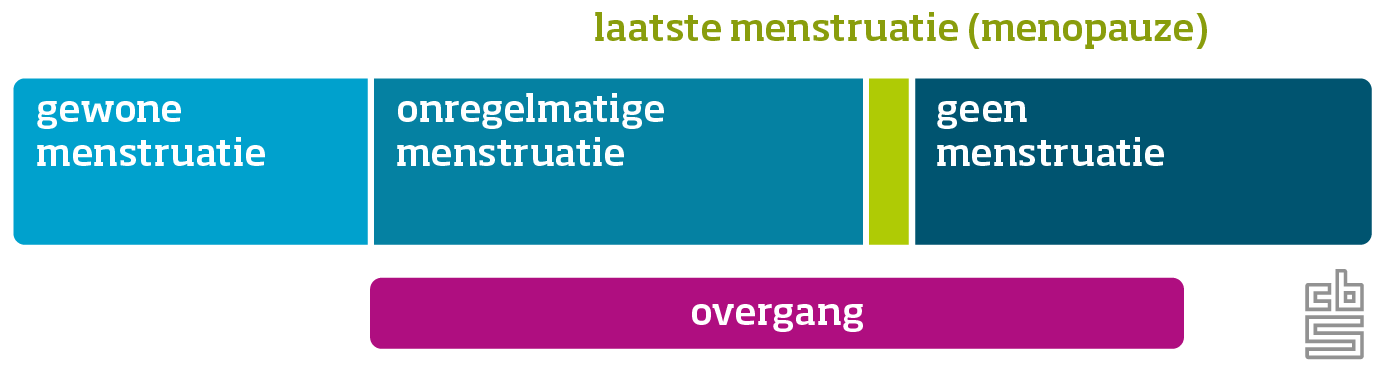 In de vervolgmeting op de Nationale Enquête Arbeidsomstandigheden (NEA) wordt hieronder de zelfgerapporteerde periode van onregelmatige menstruatie verstaan bij vrouwen vanaf 40 jaar. Jongere vrouwen zijn niet benaderd voor het onderzoek, waardoor overgang vóór de leeftijd van 40 jaar niet in beeld is. De periode van de eerste menstruatievrije jaren kan op basis van de meting niet onderscheiden worden van de latere menstruatievrije jaren en wordt daarom niet tot de overgang gerekend.