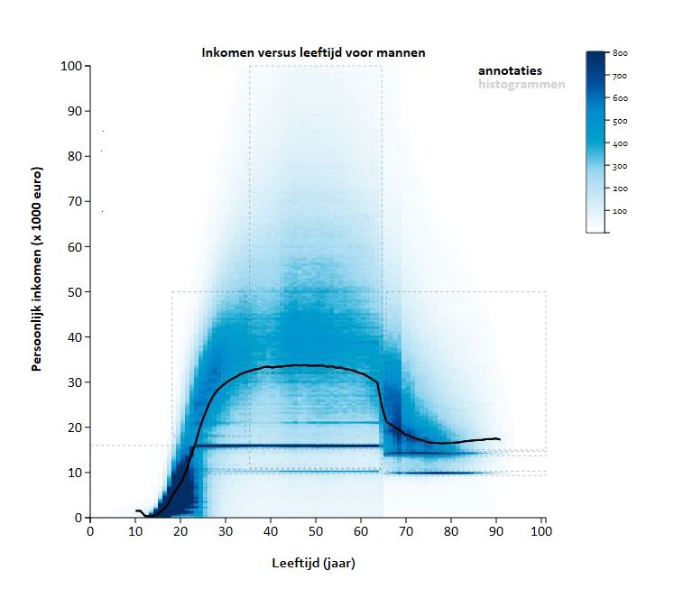 Er zijn nog meer horizontale strepen te zien, die allemaal stukken minder markant boven het maaiveld uitsteken. Het minimumloon manifesteert zich rond de 21 duizend euro, maar is onder andere wegens deeltijdwerk diffuser dan de bijstand. Andere hoge concentraties van inkomen tussen de 18 en 65 jaar zullen overeenkomen met loonschalen voor ambtenaren en met collectieve lonen voor veelvoorkomende beroepen, vastgelegd in cao’s. Met name bij de hogere inkomens lichten ronde bedragen (bijvoorbeeld precies 30, 40, 50, of 60 duizend euro) enigszins op; dit betreft vooral zelfstandig ondernemers en directeur-grootaandeelhouders.