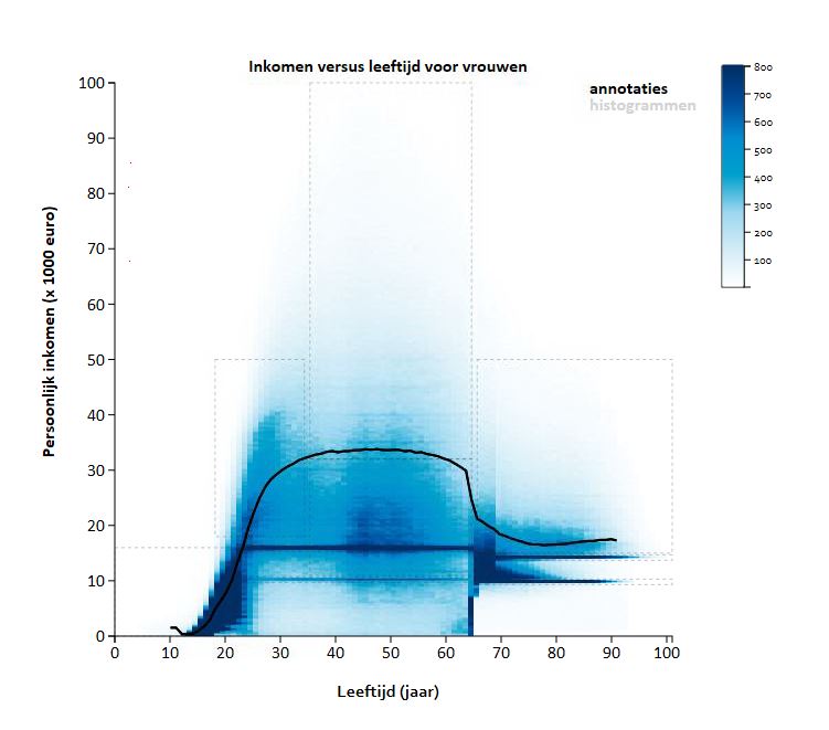Er zijn ook twee scherpe verticale lijnen te onderscheiden die zich over het hele inkomensspectrum uitstrekken, bij respectievelijk 65 en 68 jaar. Bij 65 jaar begint voor velen het pensioen, en 68 jaar was in 2015 de leeftijd van de golf babyboomers geboren in 1946; zie ook de bevolkingspiramide.