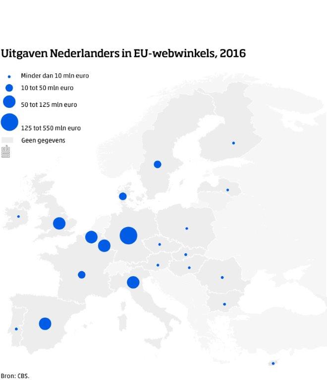 Ruim 80 procent van de buitenlandse Europese internetuitgaven in 2016 werd gedaan bij bedrijven die in Duitsland, Groot-Brittannië, België of Italië zijn gevestigd. Duitse webwinkels zijn koploper met ruim 50 procent van de waarde van alle aankopen. Daarna volgen Groot-Brittannië met ongeveer 12 procent en België en Italië met elk ongeveer 8 procent. De overige 20 procent van de bestedingen werd gedaan bij webwinkels verspreid over vrijwel de hele Europese Unie. In deze cijfers staat de vestigingslocatie van bedrijven centraal, niet de domeinnaam of taal van de website. De taal van de website is in veel gevallen namelijk Nederlands.