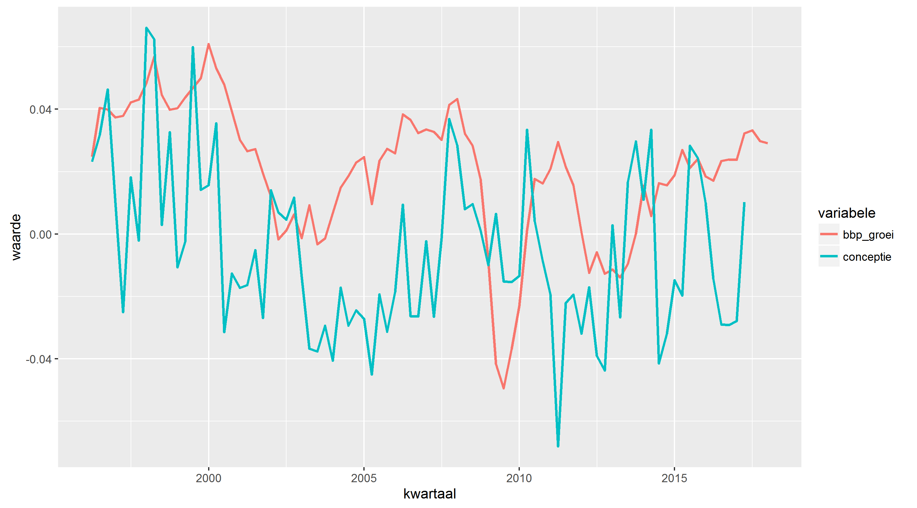 CBS onderzocht of de Amerikaanse situatie vergelijkbaar is met die in Nederland. Net als in het NBER rapport is de jaar-op-jaargroei van het Bruto Binnenlands Product (BBP) per kwartaal vergeleken met de jaar-op-jaargroei van het aantal levendgeborenen. De kwartaalreeks voor het aantal levendgeborenen werd met drie kwartalen verschoven als ruwe schatting voor de conceptiedatum. De jaar-op-jaargroei van het aantal concepties blijkt enige tijd voor economische krimp inderdaad af te nemen. Echter, anders dan in de Amerikaanse situatie treden ook aanzienlijke afnames op zónder dat ze gevolgd worden door een recessie. Er is daarmee geen aanleiding om aan te nemen dat er bij een afname van het aantal vroege zwangerschappen een economische recessie op komst is.